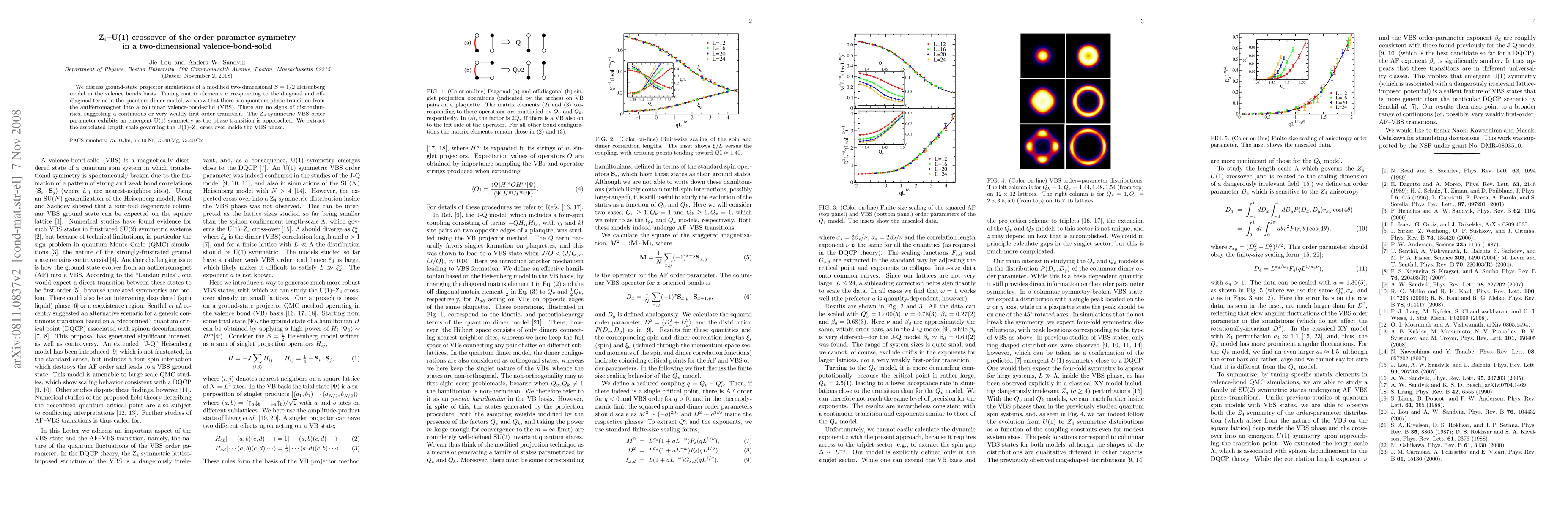 This paper investigates a modified two-dimensional S=1/2 Heisenberg model using ground-state projector simulations, revealing a quantum phase transition from antiferromagnetism to a columnar valence-bond-solid. The study finds a continuous transition and identifies an emergent U(1) symmetry in the Z4-symmetric VBS order parameter, with a specific length-scale governing the U(1)-Z4 crossover.