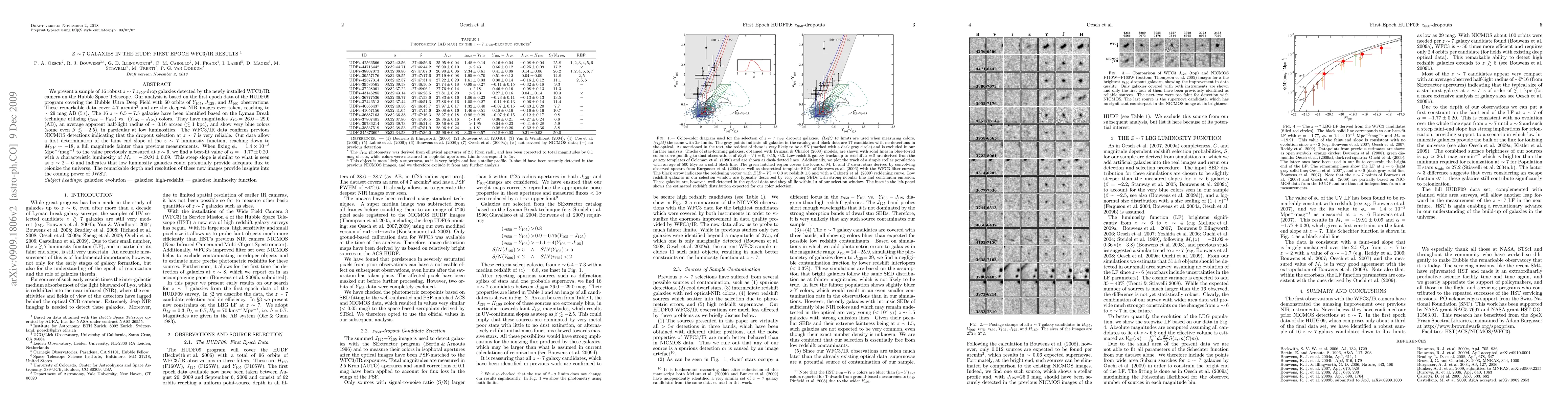We present a sample of 16 robust z~7 z-drop galaxies detected by the newly installed WFC3/IR camera on the Hubble Space Telescope. Our analysis is based on the first epoch data of the HUDF09 program covering the Hubble Ultra Deep Field with 60 orbits of Y, J, and H observations. These remarkable data cover 4.7 arcmin^2 and are the deepest NIR images ever taken, reaching to ~29 mag AB (5 sigma). The 16 z~6.5-7.5 galaxies have been identified based on the Lyman Break technique utilizing (z-Y) vs. (Y-J) colors. They have magnitudes J = 26.0-29.0 (AB), an average apparent half-light radius of ~0.16 arcsec (<~1 kpc), and show very blue colors (some even beta<~-2.5), in particular at low luminosities. The WFC3/IR data confirms previous NICMOS detections indicating that the dropout selection at z~7 is very reliable. Our data allow a first determination of the faint end slope of the z~7 luminosity function, reaching down to M_UV ~ -18, a full magnitude fainter than previous measurements. When fixing phi*=1.4e-3/Mpc^3/mag to the value previously measured at z~6, we find a best-fit value of alpha=-1.77+-0.20, with a characteristic luminosity of M_*=-19.91+-0.09. This steep slope is similar to what is seen at z~2-6 and indicates that low luminosity galaxies could potentially provide adequate flux to reionize the universe. The remarkable depth and resolution of these new images provide insights into the coming power of JWST.