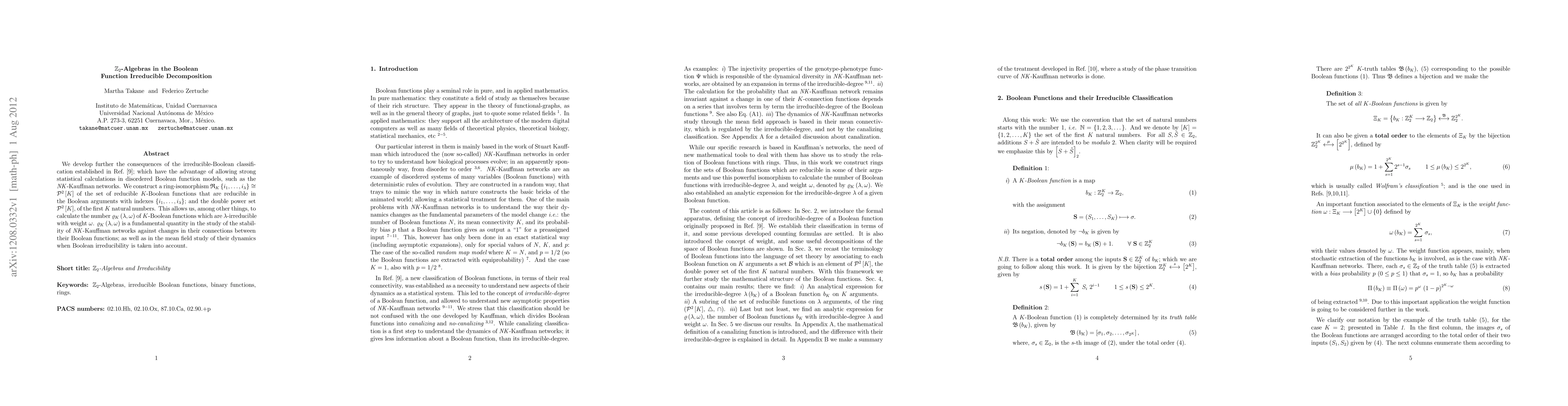 This paper develops a ring-isomorphism between the set of reducible K-Boolean functions and the double power set of the first K natural numbers, facilitating statistical calculations in disordered Boolean function models like NK-Kauffman networks. It also introduces the quantity $\varrho_K (\lambda, \omega)$ to study the stability and dynamics of NK-Kauffman networks.