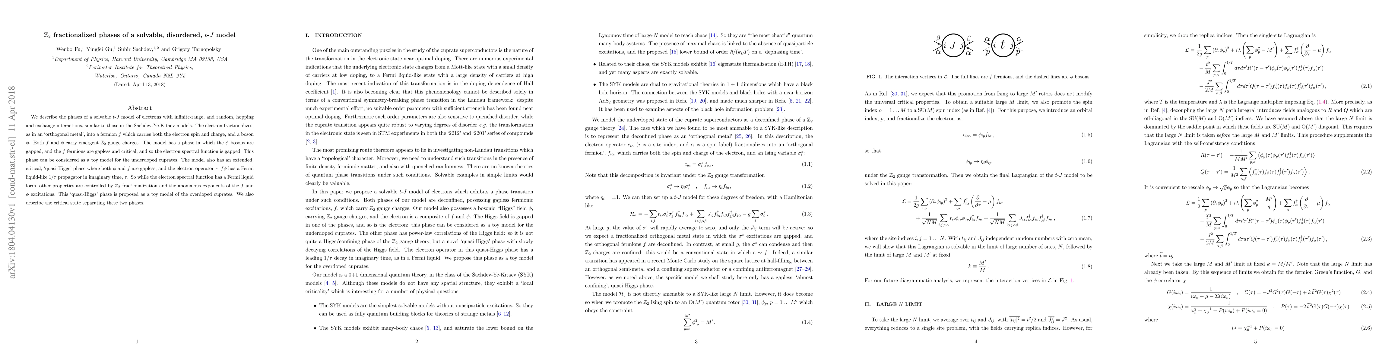 We describe the phases of a solvable $t$-$J$ model of electrons with infinite-range, and random, hopping and exchange interactions, similar to those in the Sachdev-Ye-Kitaev models. The electron fractionalizes, as in an `orthogonal metal', into a fermion $f$ which carries both the electron spin and charge, and a boson $\phi$. Both $f$ and $\phi$ carry emergent $\mathbb{Z}_2$ gauge charges. The model has a phase in which the $\phi$ bosons are gapped, and the $f$ fermions are gapless and critical, and so the electron spectral function is gapped. This phase can be considered as a toy model for the underdoped cuprates. The model also has an extended, critical, `quasi-Higgs' phase where both $\phi$ and $f$ are gapless, and the electron operator $\sim f \phi$ has a Fermi liquid-like $1/\tau$ propagator in imaginary time, $\tau$. So while the electron spectral function has a Fermi liquid form, other properties are controlled by $\mathbb{Z}_2$ fractionalization and the anomalous exponents of the $f$ and $\phi$ excitations. This `quasi-Higgs' phase is proposed as a toy model of the overdoped cuprates. We also describe the critical state separating these two phases.