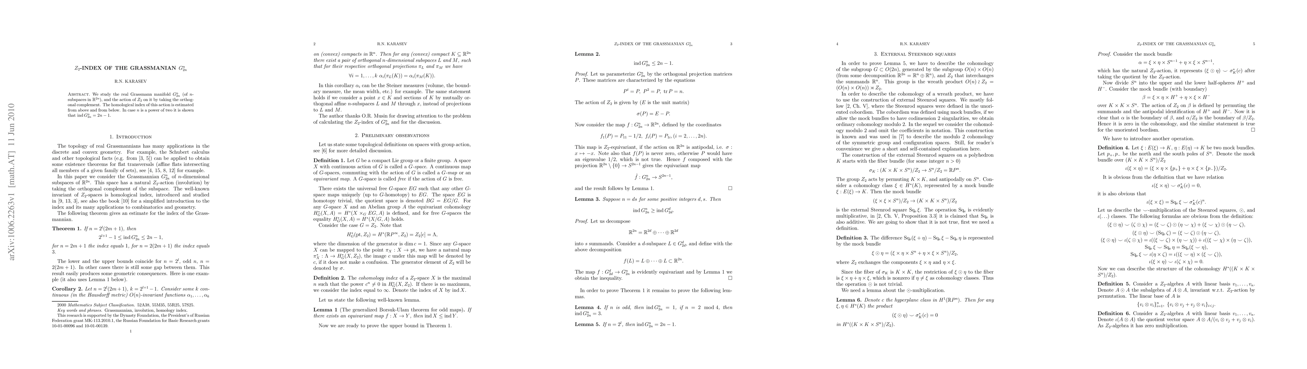 Summary: This paper investigates the $Z_2$-index of the real Grassmannian $G_{2n}^n$, focusing on the action of $Z_2$ through orthogonal complements. It provides bounds for the homological index and determines that $\hind G_{2n}^n=2n-1$ when $n$ is a power of two.
