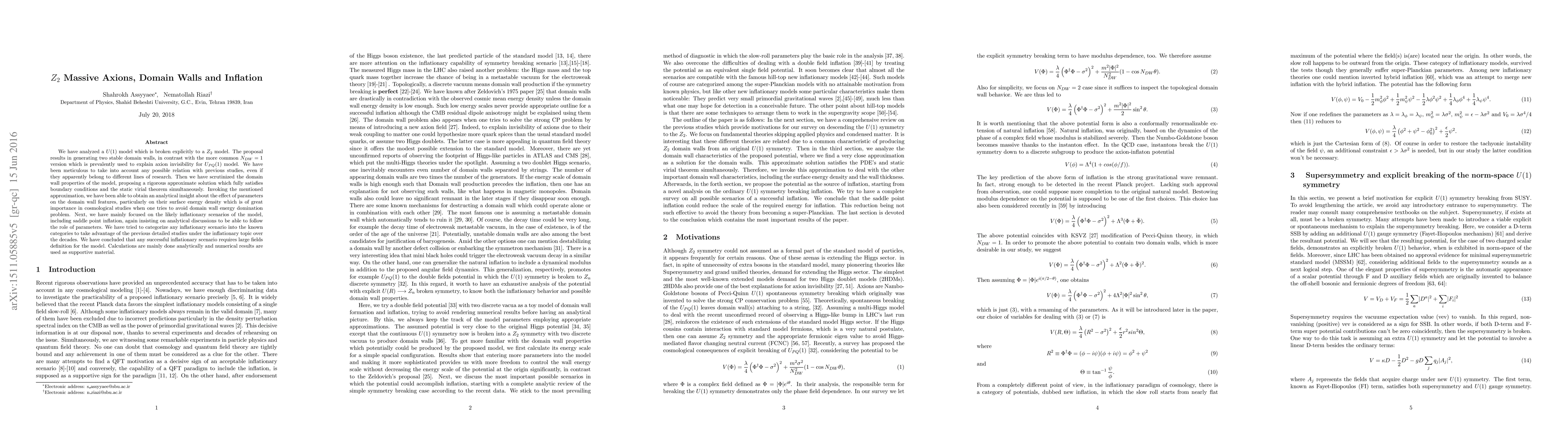 We have analyzed a $U(1)$ model which is broken explicitly to a $Z_2$ model. The model results in generating two stable domain walls, in contrast with the more common $N_{DW}=1$ version which is prevalently used to explain axion invisibility for $U_{PQ}(1)$ model. We have been meticulous to take into account any possible relation with previous studies, even if they apparently belong to different lines of research. Then we have scrutinized the domain wall properties of the model,proposing a rigorous approximate solution which fully satisfies boundary conditions and the static virial theorem simultaneously. Invoking the mentioned approximation, we have been able to obtain an analytical insight about the effect of parameters on the domain wall features, particularly on their surface energy density which is of great importance in cosmological studies when one tries to avoid domain wall energy domination problem. Next, we have mainly focused on the likely inflationary scenarios of the model, including saddle point inflation, again insisting on analytical discussions to be able to follow the role of parameters. We have tried to categorize any inflationary scenario into the known categories to take advantage of the previous detailed studies under the inflationary topic over the decades. We have concluded that any successful inflationary scenario requires large fields definition for the model. Calculations are mainly done analytically and numerical results are used as supportive material.