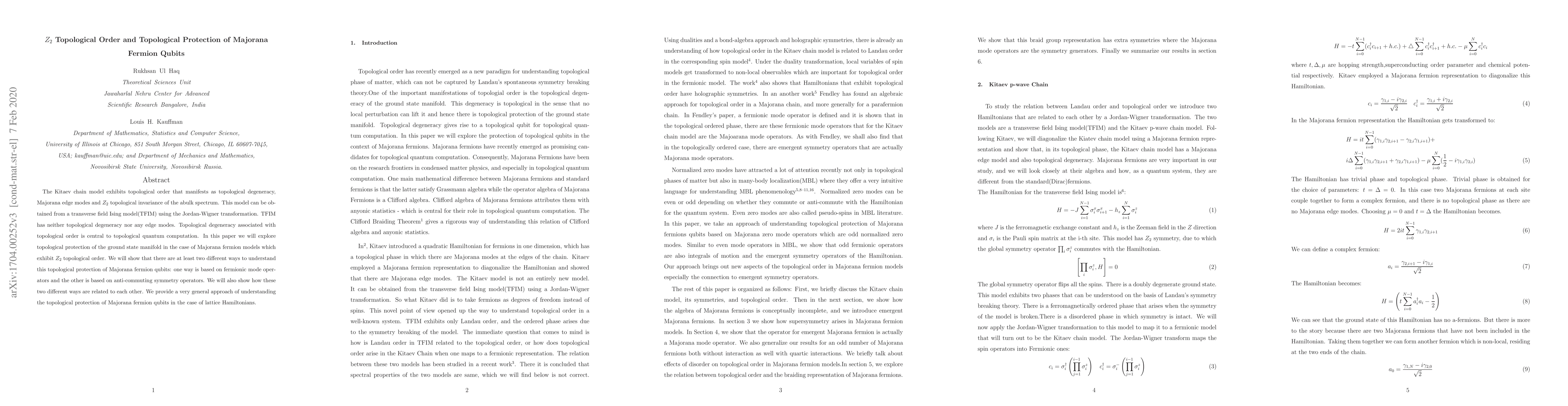 The Kitaev chain model exhibits topological order that manifests as topological degeneracy, Majorana edge modes and $Z_{2}$ topological invariance of the abulk spectrum. This model can be obtained from a transverse field Ising model(TFIM) using the Jordan-Wigner transformation. TFIM has neither topological degeneracy nor any edge modes. Topological degeneracy associated with topological order is central to topological quantum computation. In this paper we will explore topological protection of the ground state manifold in the case of Majorana fermion models which exhibit $Z_{2}$ topological order. We will show that there are at least two different ways to understand this topological protection of Majorana fermion qubits: one way is based on fermionic mode operators and the other is based on anti-commuting symmetry operators. We will also show how these two different ways are related to each other. We provide a very general approach of understanding the topological protection of Majorana fermion qubits in the case of lattice Hamiltonians.