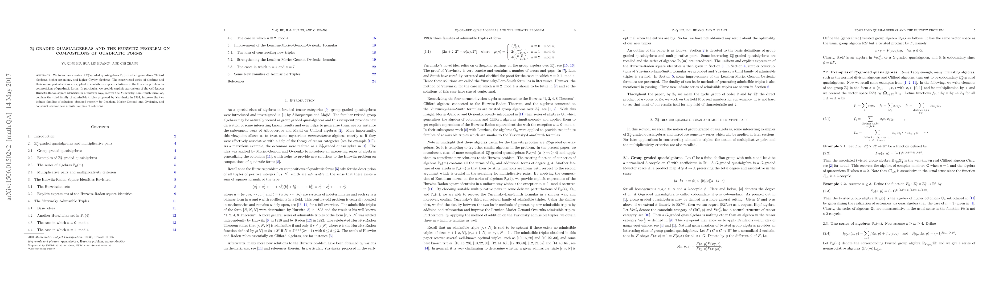 We introduce a series of $\Z_2^n$-graded quasialgebras $\bbP_n(m)$ which generalizes Clifford algebras, higher octonions, and higher Cayley algebras. The constructed series of algebras and their minor perturbations are applied to contribute explicit solutions to the Hurwitz problem on compositions of quadratic forms. In particular, we provide explicit expressions of the well-known Hurwitz-Radon square identities in a uniform way, recover the Yuzvinsky-Lam-Smith formulas, confirm the third family of admissible triples proposed by Yuzvinsky in 1984, improve the two infinite families of solutions obtained recently by Lenzhen, Morier-Genoud and Ovsienko, and construct several new infinite families of solutions.