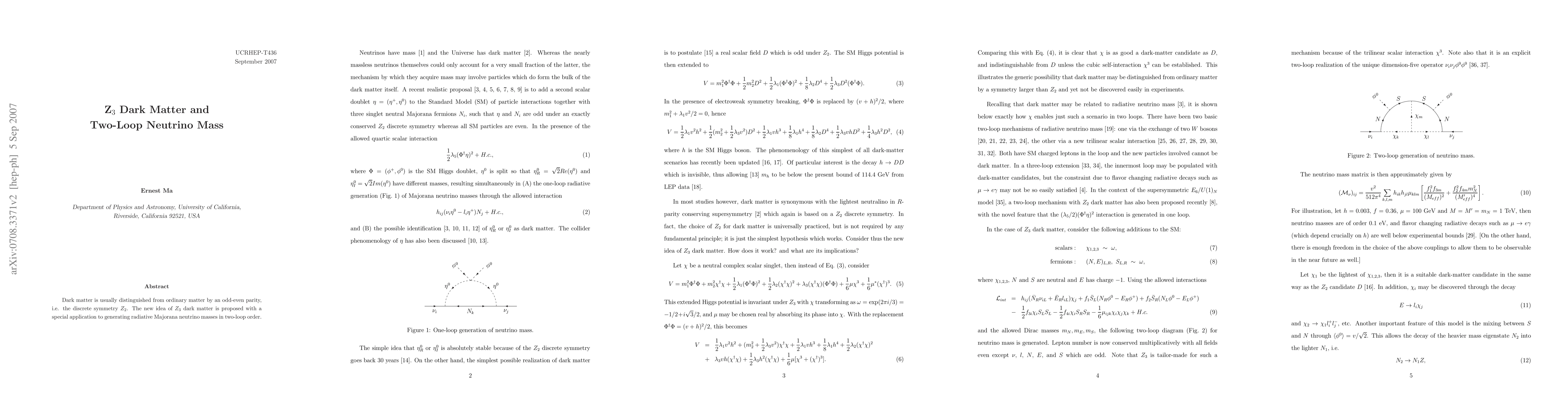 The paper introduces Z_3 dark matter, a novel concept differentiating dark matter from ordinary matter. It proposes a method to generate radiative Majorana neutrino masses at two-loop order, offering a fresh perspective in dark matter and neutrino mass research.