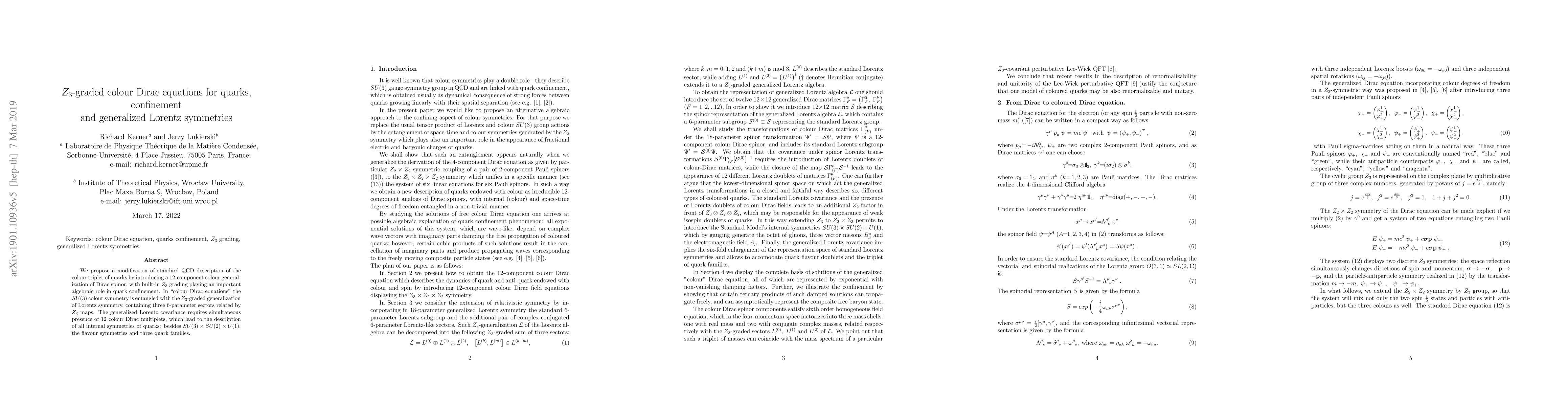 We propose a modification of standard QCD description of the colour triplet of quarks describing quark fields endowed with colour degree of freedom by introducing a 12-component colour generalization of Dirac spinor, with built-in Z_3 grading playing an important algebraic role in quark confinement. In "colour Dirac equations" the SU(3) colour symmetry is entangled with the Z_3-graded generalization of Lorentz symmetry, containing three 6-parameter sectors related by Z_3 maps. The generalized Lorentz covariance requires simultaneous presence of 24 colour Dirac multiplets, which lead to the description of all internal symmetries of quarks: besides SU(3) \times SU(2) \times U(1), the flavour symmetries and three quark families.