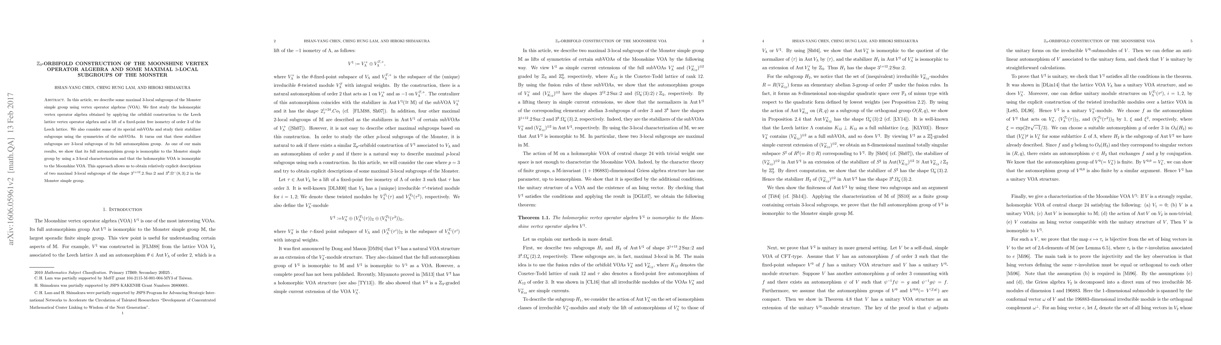 This paper constructs a $\Z_3$-orbifold of the Moonshine vertex operator algebra and identifies maximal $3$-local subgroups of the Monster group using vertex operator algebras, revealing their explicit forms and confirming the isomorphism of the full automorphism group to the Monster simple group.