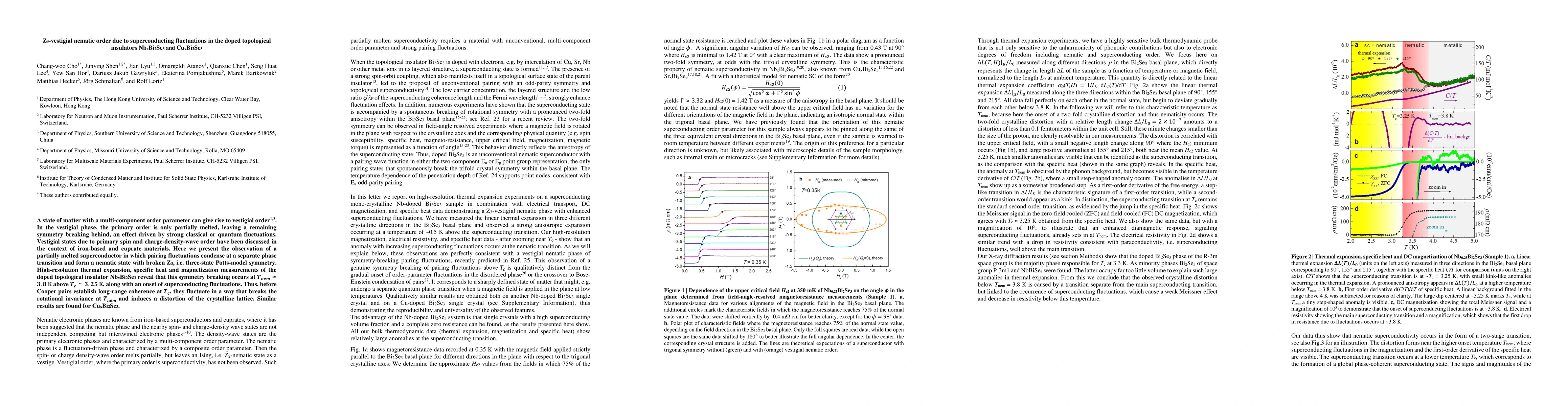 Researchers observe a partially melted superconductor in doped topological insulators NbxBi2Se3 and CuxBi2Se3, revealing vestigial nematic order due to superconducting fluctuations at Tnem=3.8 K.