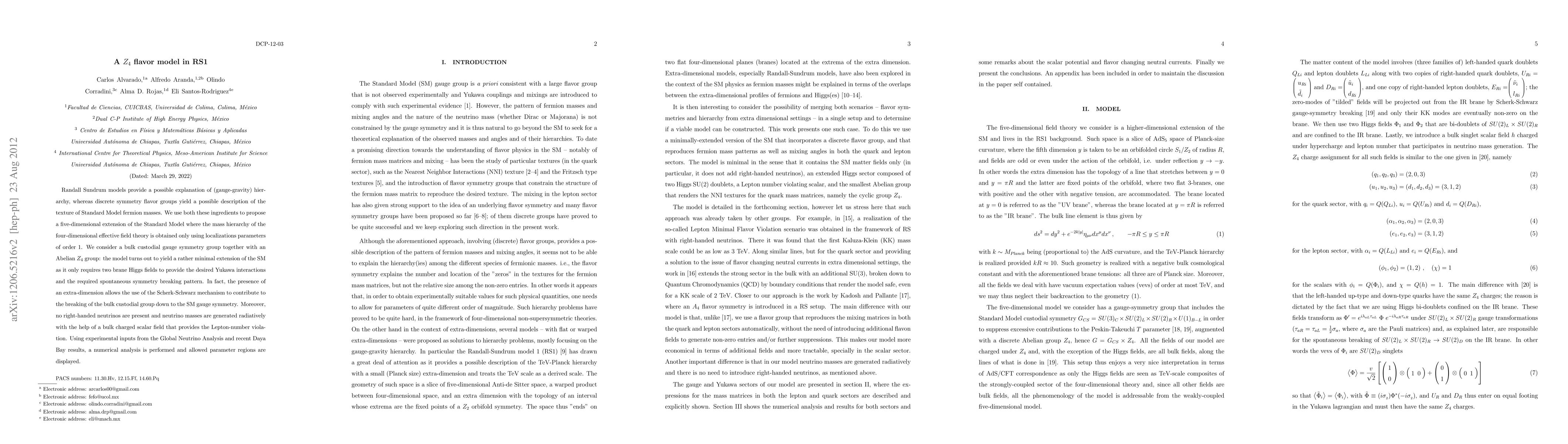 This paper proposes a five-dimensional Z_4 flavor model within the Randall-Sundrum framework, achieving mass hierarchy through localization parameters. It utilizes a Scherk-Schwarz mechanism for symmetry breaking and generates neutrino masses radiatively, with no right-handed neutrinos.