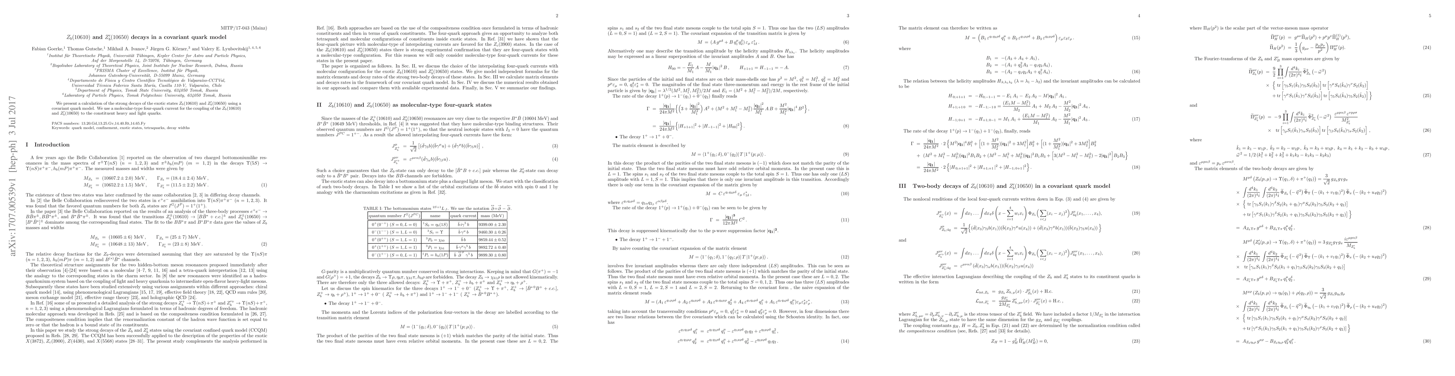 This paper explores the strong decays of the exotic $Z_b(10610)$ and $Z_b'(10650)$ states using a covariant quark model, employing a molecular-type four-quark current to describe their interactions. The study aims to understand the decay mechanisms of these states.