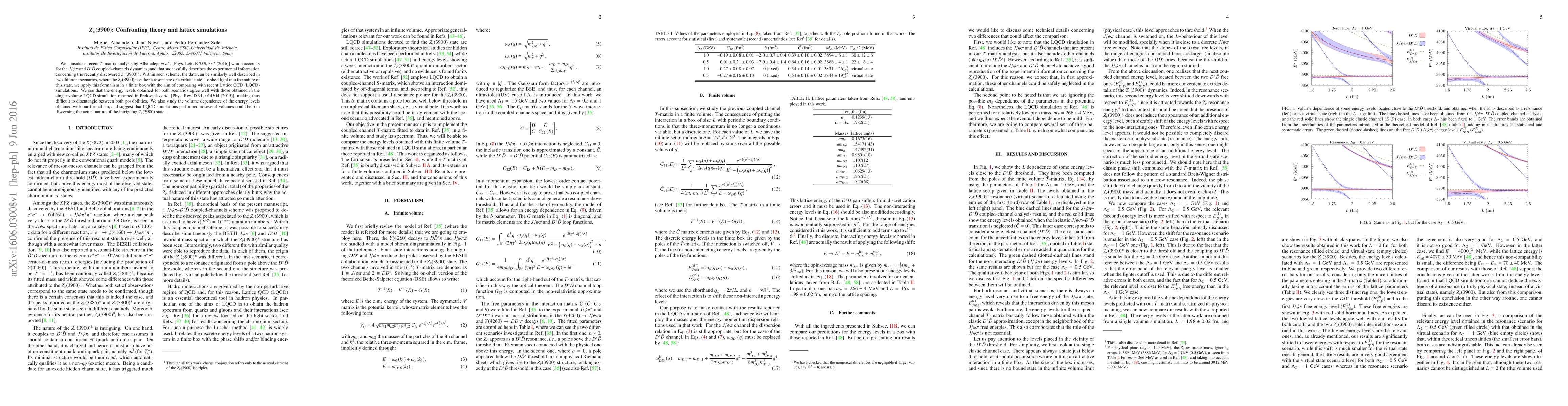 We consider a recent $T$-matrix analysis by Albaladejo {\it et al.}, [Phys.\ Lett.\ B {\bf 755}, 337 (2016)] which accounts for the $J/\psi\pi$ and $D^\ast\bar{D}$ coupled--channels dynamics, and that successfully describes the experimental information concerning the recently discovered $Z_c(3900)^\pm$. Within such scheme, the data can be similarly well described in two different scenarios, where the $Z_c(3900)$ is either a resonance or a virtual state. To shed light into the nature of this state, we apply this formalism in a finite box with the aim of comparing with recent Lattice QCD (LQCD) simulations. We see that the energy levels obtained for both scenarios agree well with those obtained in the single-volume LQCD simulation reported in Prelovsek {\it et al.} [Phys.\ Rev.\ D {\bf 91}, 014504 (2015)], making thus difficult to disentangle between both possibilities. We also study the volume dependence of the energy levels obtained with our formalism, and suggest that LQCD simulations performed at several volumes could help in discerning the actual nature of the intriguing $Z_c(3900)$ state.