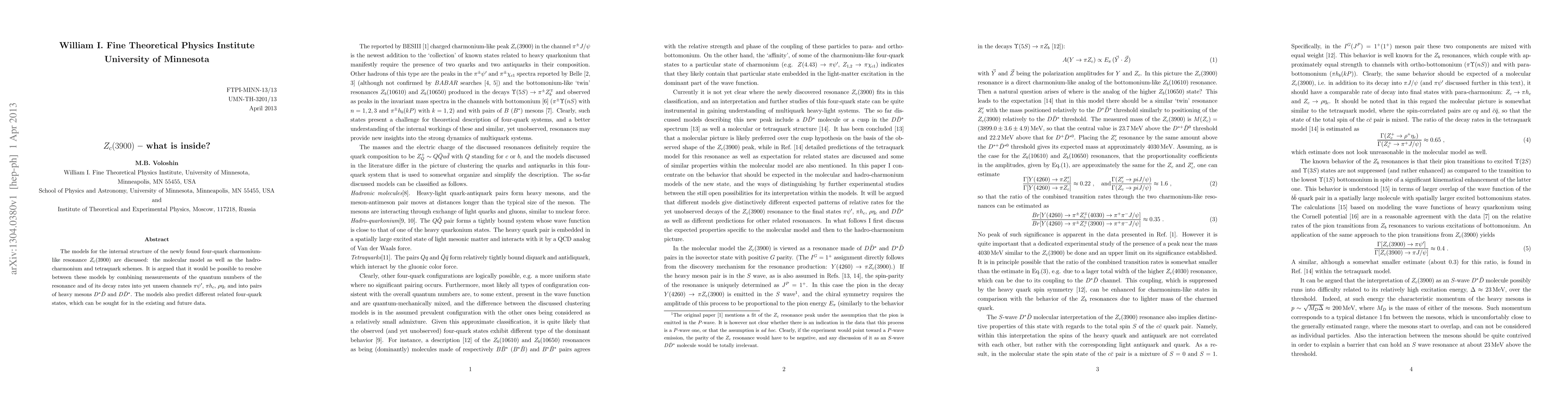 This paper discusses various models for the internal structure of the $Z_c(3900)$ resonance, including molecular, hadro-charmonium, and tetraquark schemes. The study suggests that distinguishing between these models could be achieved by measuring the resonance's quantum numbers and decay rates into specific channels, as well as searching for related four-quark states in current and future data.