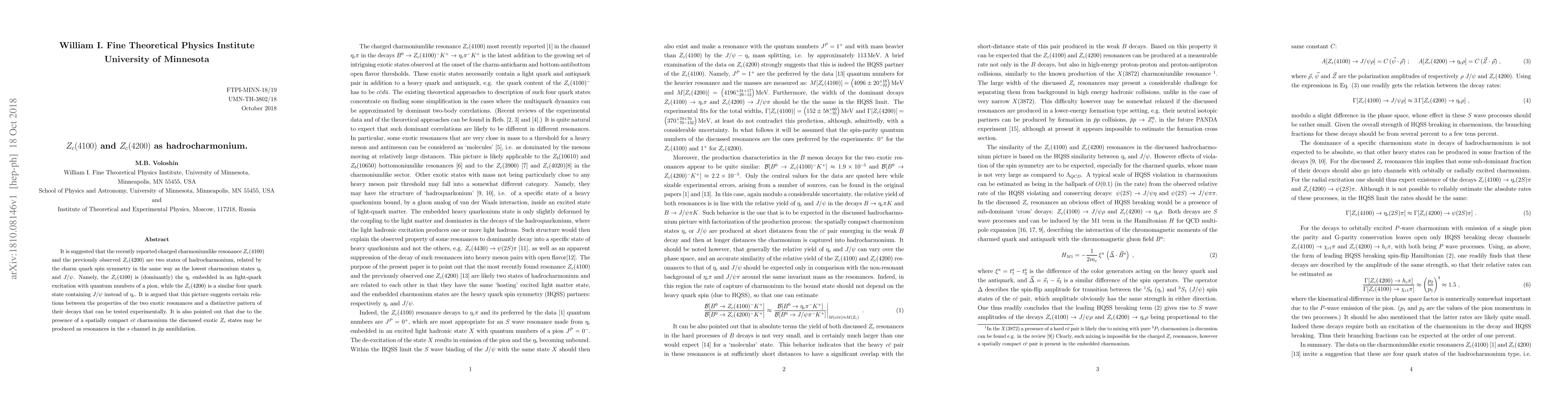 It is suggested that the recently reported charged charmoniumlike resonance $Z_c(4100)$ and the previously observed $Z_c(4200)$ are two states of hadrocharmonium, related by the charm quark spin symmetry in the same way as the lowest charmonium states $\eta_c$ and $J/\psi$. Namely, the $Z_c(4100)$ is (dominantly) the $\eta_c$ embedded in an light-quark excitation with quantum numbers of a pion, while the $Z_c(4200)$ is a similar four quark state containing $J/\psi$ instead of $\eta_c$. It is argued that this picture suggests certain relations between the properties of the two exotic resonances and a distinctive pattern of their decays that can be tested experimentally. It is also pointed out that due to the presence of a spatially compact $c \bar c$ charmonium the discussed exotic $Z_c$ states may be produced as resonances in the $s$ channel in $\bar p p$ annihilation.