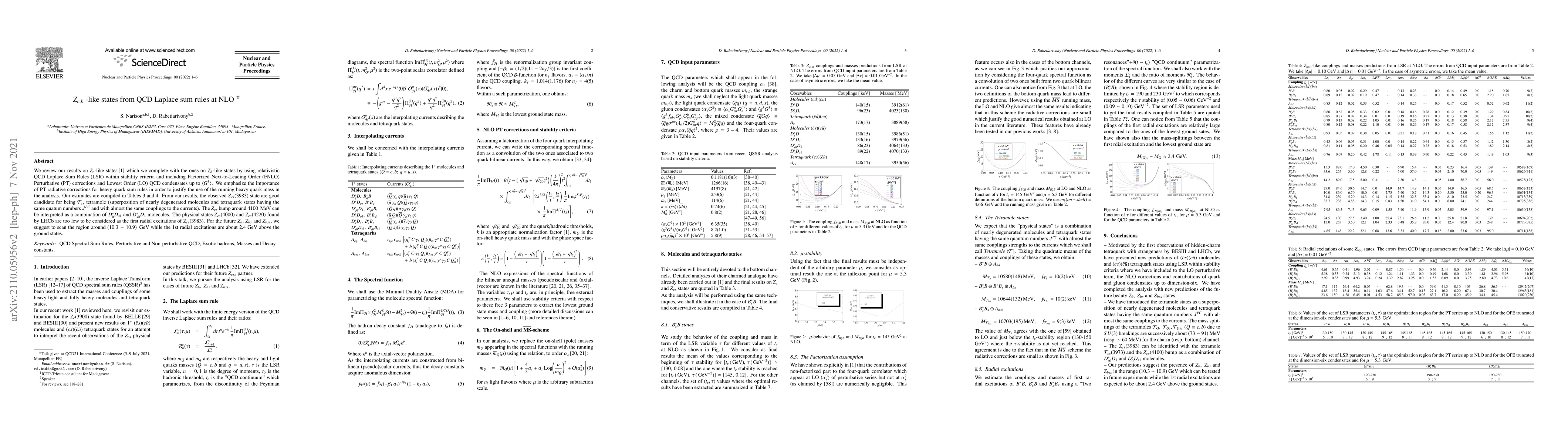 We review our results on $Z_{c}$-like states[1] which we complete with the ones on $Z_{b}$-like states by using relativistic QCD Laplace Sum Rules (LSR) within stability criteria and including Factorized Next-to-Leading Order (FNLO) Perturbative (PT) corrections and Lowest Order (LO) QCD condensates up to $\langle G^3 \rangle$. We emphasize the importance of PT radiative corrections for heavy quark sum rules in order to justify the use of the running heavy quark mass in the analysis. Our estimates are compiled in Tables 3 and 4. From our results, the observed $Z_{cs}(3983)$ state are good candidate for being ${\mathcal T}_{cs}$ tetramole (superposition of nearly degenerated molecules and tetraquark states having the same quatum numbers $J^{PC}$ and with almost the same couplings to the currents). The $Z_{cs}$ bump around 4100 MeV can be interpreted as a combination of $D^{*}_{0}D_{s1}$ and $D^{*}_{s0}D_{1}$ molecules. The physical states $Z_{cs}(4000)$ and $Z_{cs}(4220)$ found by LHCb are too low to be considered as the first radial excitations of $Z_{cs}(3983)$. For the future $Z_{b}$, $Z_{bs}$ and $Z_{bss}$, we suggest to scan the region around $(10.3 \sim 10.9)$ GeV while the 1st radial excitations are about 2.4 GeV above the ground states.
