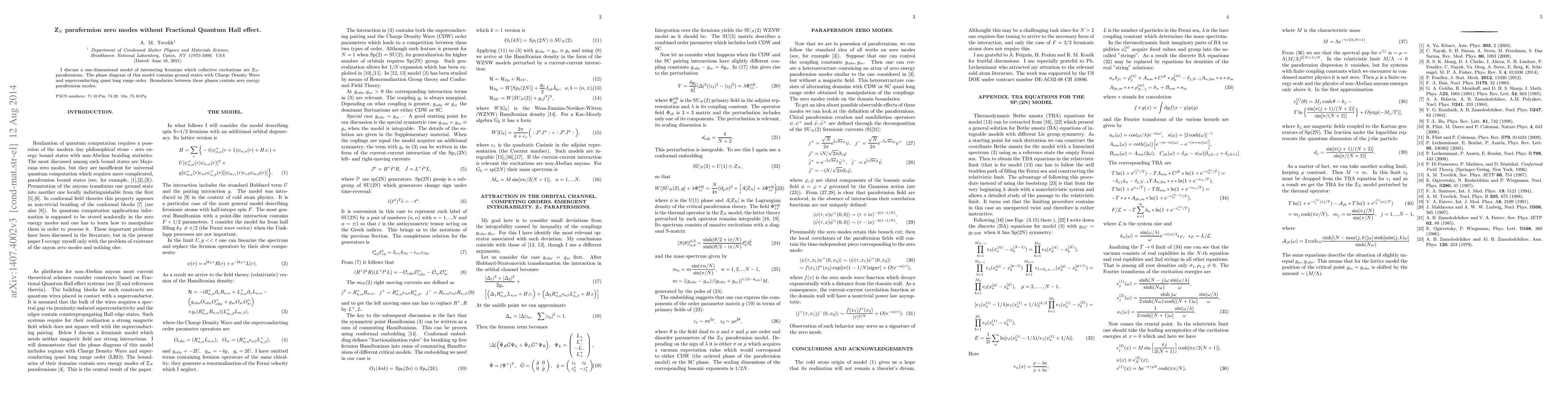 I discuss a one-dimensional model of interacting fermions which collective excitations are Z$_N$-parafermions. The phase diagram of this model contains ground states with Charge Density Wave and superconducting quasi long range order. Boundaries between these phases contain zero energy parafermion modes.
