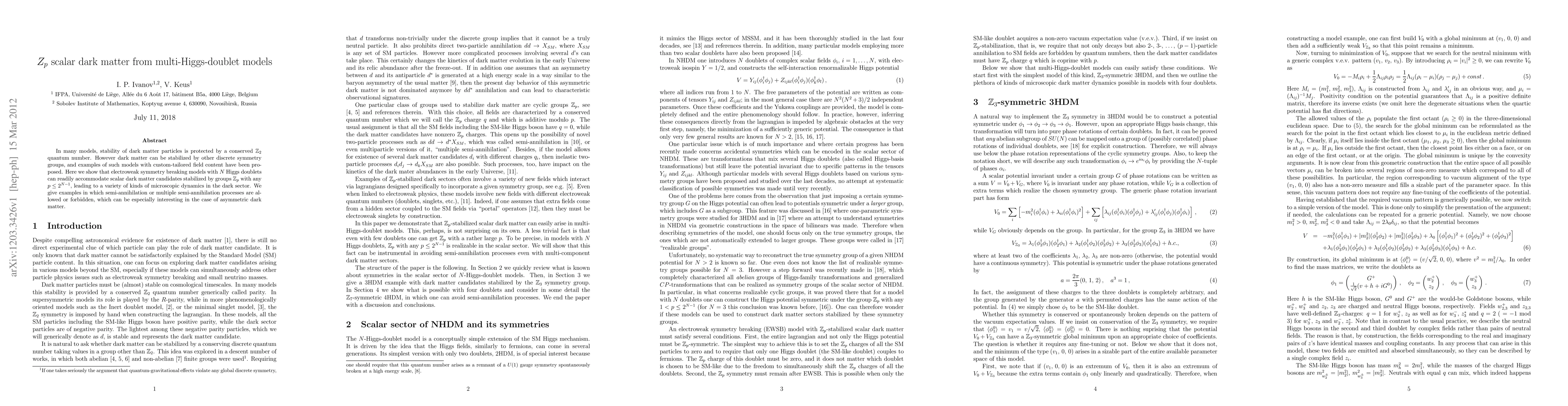In many models, stability of dark matter particles is protected by a conserved Z_2 quantum number. However dark matter can be stabilized by other discrete symmetry groups, and examples of such models with custom-tailored field content have been proposed. Here we show that electroweak symmetry breaking models with N Higgs doublets can readily accommodate scalar dark matter candidates stabilized by groups Z_p with any $p \le 2^{N-1}$, leading to a variety of kinds of microscopic dynamics in the dark sector. We give examples in which semi-annihilation or multiple semi-annihilation processes are allowed or forbidden, which can be especially interesting in the case of asymmetric dark matter.