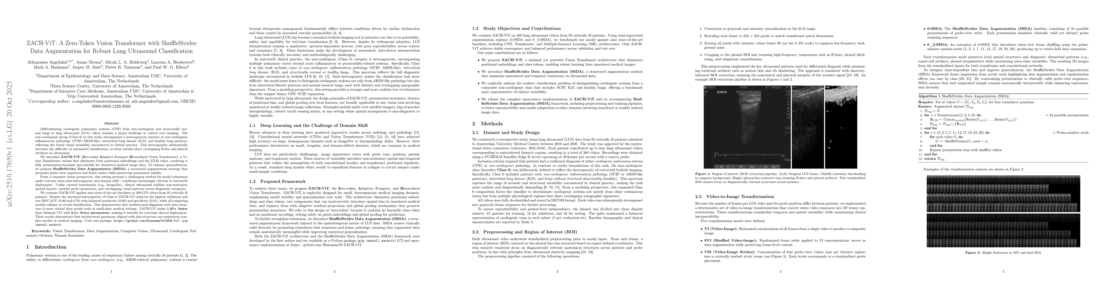 The study introduces ZACH-ViT, a zero-token compact hybrid Vision Transformer designed for automated differentiation of cardiogenic and non-cardiogenic pulmonary edema in lung ultrasound videos. It employs Shuffle Strides Data Augmentation (SSDA) to systematically permute transducer placements and frame order while preserving anatomical plausibility.