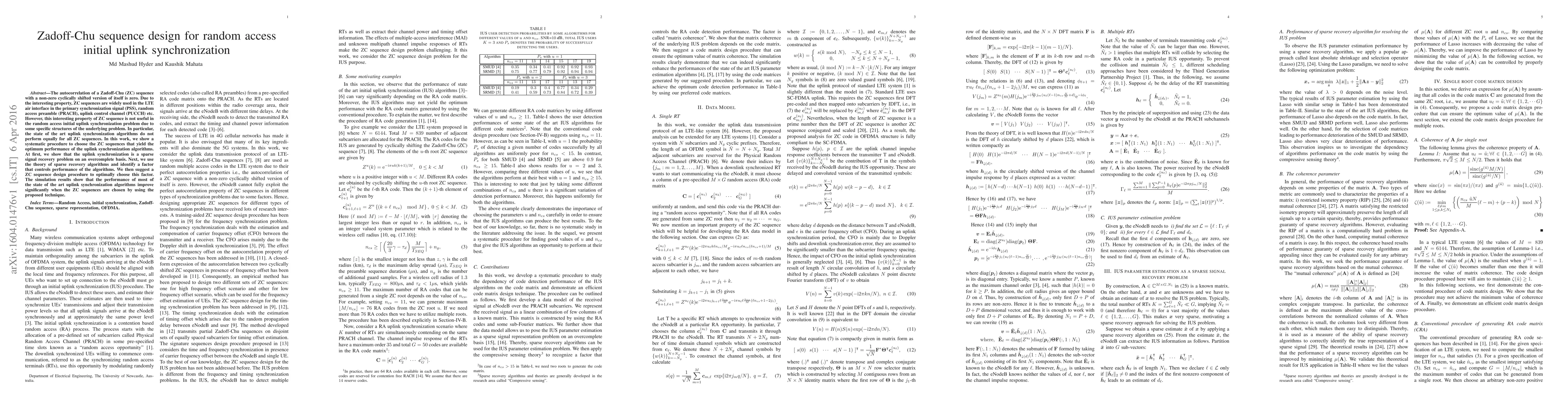 This paper presents a systematic method for selecting Zadoff-Chu (ZC) sequences to optimize random access initial uplink synchronization in LTE networks. It demonstrates that uplink synchronization can be framed as a sparse signal recovery problem and proposes a design procedure to enhance the performance of synchronization algorithms using ZC sequences.