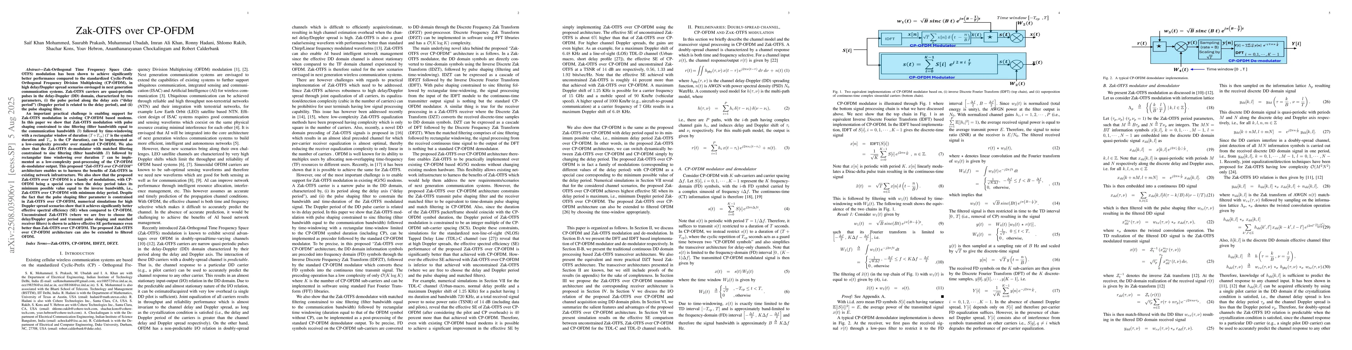 Zak-Orthogonal Time Frequency Space (Zak-OTFS) modulation has been shown to achieve significantly better performance compared to the standardized Cyclic-Prefix Orthogonal Frequency Division Multiplexing (CP-OFDM), in high delay/Doppler spread scenarios envisaged in next generation communication systems. Zak-OTFS carriers are quasi-periodic pulses in the delay-Doppler (DD) domain, characterized by two parameters, (i) the pulse period along the delay axis (``delay period") (Doppler period is related to the delay period), and (ii) the pulse shaping filter. An important practical challenge is enabling support for Zak-OTFS modulation in existing CP-OFDM based modems. In this paper we show that Zak-OTFS modulation with pulse shaping constrained to sinc filtering (filter bandwidth equal to the communication bandwidth $B$) followed by time-windowing with a rectangular window of duration $(T + T_{cp})$ ($T$ is the symbol duration and $T_{cp}$ is the CP duration), can be implemented as a low-complexity precoder over standard CP-OFDM. We also show that the Zak-OTFS de-modulator with matched filtering constrained to sinc filtering (filter bandwidth $B$) followed by rectangular time windowing over duration $T$ can be implemented as a low-complexity post-processing of the CP-OFDM de-modulator output. This proposed ``Zak-OTFS over CP-OFDM" architecture enables us to harness the benefits of Zak-OTFS in existing network infrastructure. We also show that the proposed Zak-OTFS over CP-OFDM is a family of modulations, with CP-OFDM being a special case when the delay period takes its minimum possible value equal to the inverse bandwidth, i.e., Zak-OTFS over CP-OFDM with minimum delay period.