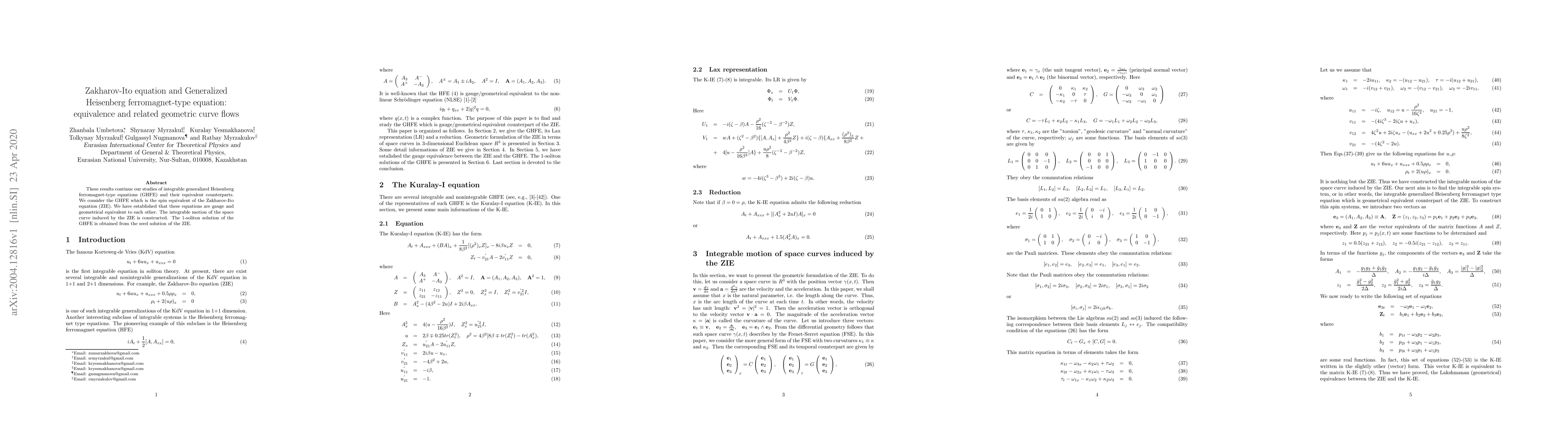 These results continue our studies of integrable generalized Heisenberg ferromagnet-type equations (GHFE) and their equivalent counterparts. We consider the GHFE which is the spin equivalent of the Zakharov-Ito equation (ZIE). We have established that these equations are gauge and geometrical equivalent to each other. The integrable motion of space curves induced by the ZIE is constructed. The 1-soliton solution of the GHFE is obtained from the seed solution of the ZIE.