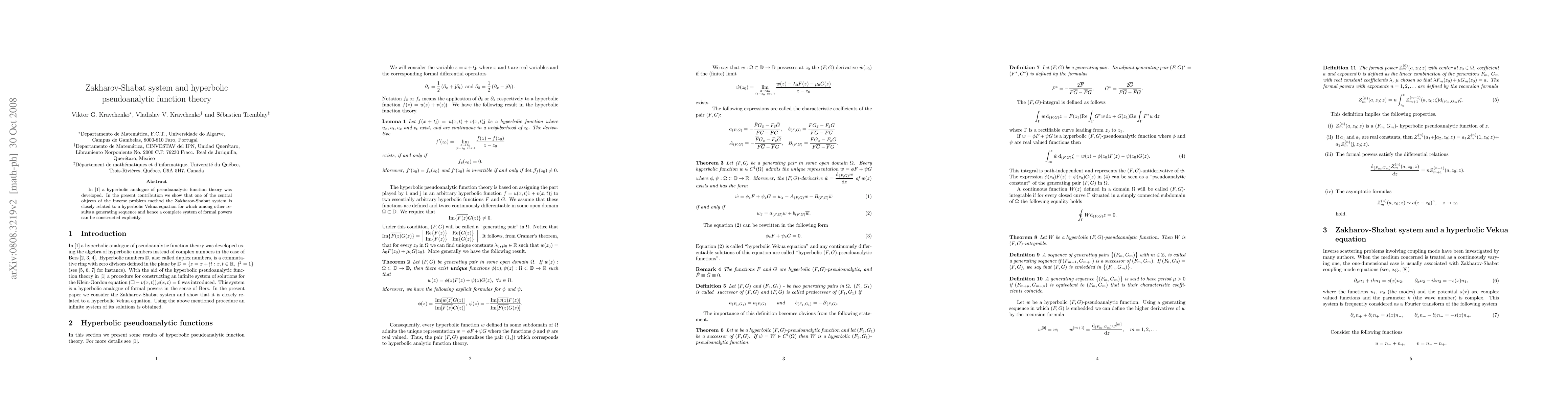 This paper demonstrates the connection between the Zakharov-Shabat system and hyperbolic pseudoanalytic function theory, showing that the system is linked to a hyperbolic Vekua equation, allowing for the explicit construction of a generating sequence and a complete system of formal powers.