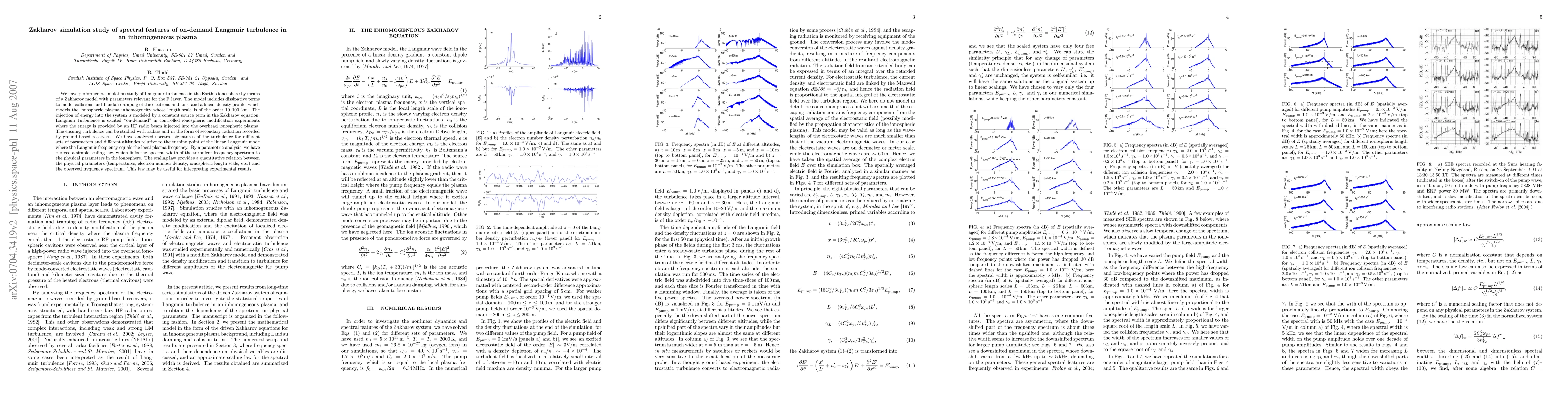 A Zakharov model simulation explores spectral features of Langmuir turbulence in Earth's ionosphere, accounting for plasma inhomogeneity and dissipation. The study derives a scaling law relating ionospheric parameters to the turbulent frequency spectrum, aiding the interpretation of experimental data.