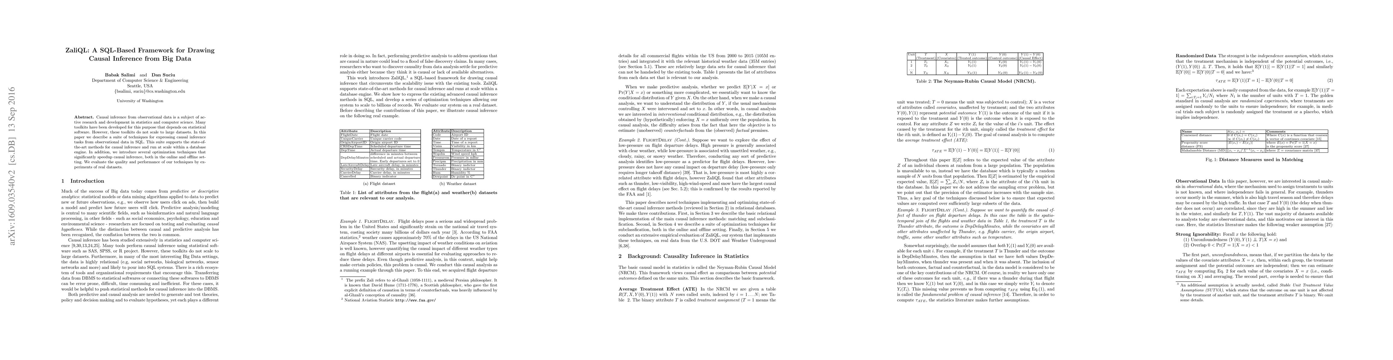 Causal inference from observational data is a subject of active research and development in statistics and computer science. Many toolkits have been developed for this purpose that depends on statistical software. However, these toolkits do not scale to large datasets. In this paper we describe a suite of techniques for expressing causal inference tasks from observational data in SQL. This suite supports the state-of-the-art methods for causal inference and run at scale within a database engine. In addition, we introduce several optimization techniques that significantly speedup causal inference, both in the online and offline setting. We evaluate the quality and performance of our techniques by experiments of real datasets.