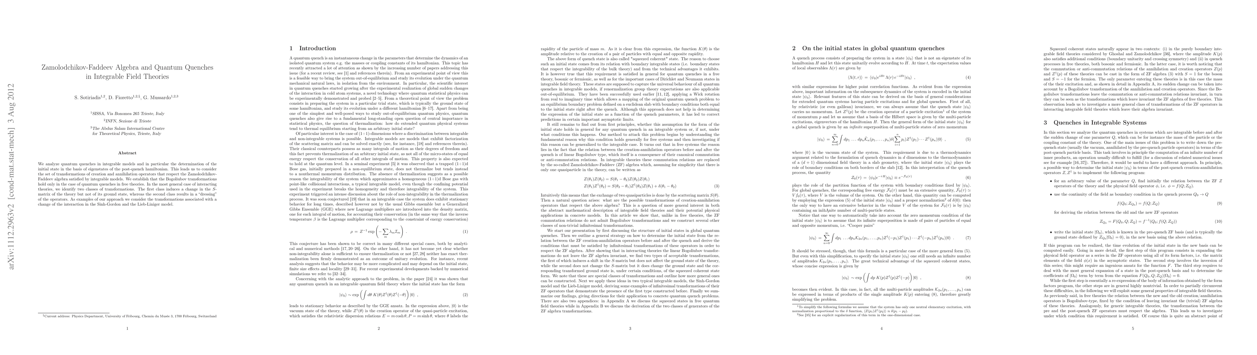 This paper investigates quantum quenches in integrable field theories, focusing on the initial state determination in the basis of post-quench Hamiltonian eigenstates. It identifies two classes of transformations respecting the Zamolodchikov-Faddeev algebra, with Bogoliubov transformations applicable only to free theories, while the general case involves transformations that alter the S-matrix or "dress" operators.