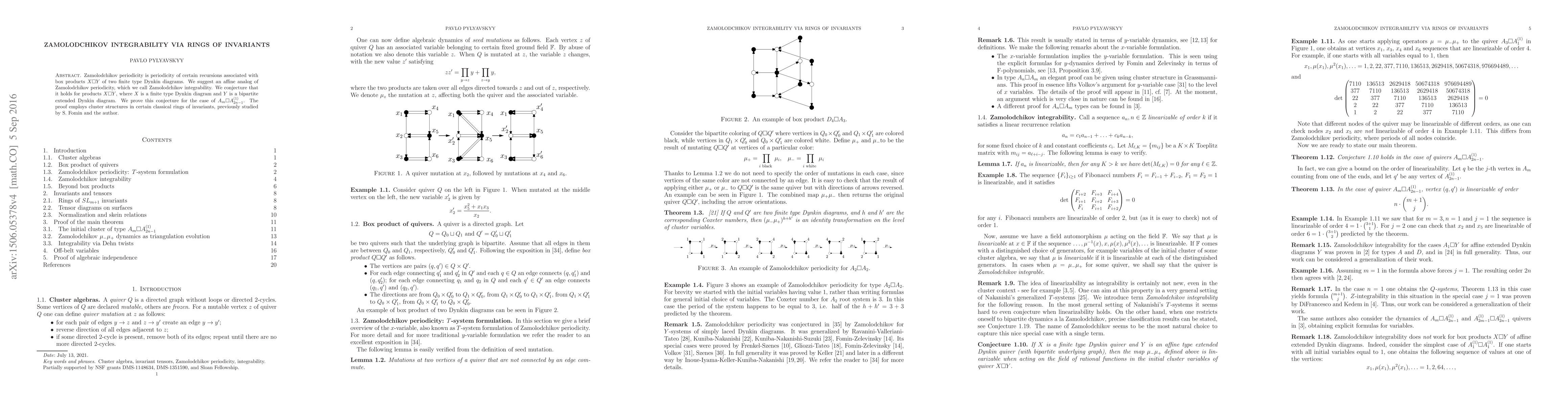 Zamolodchikov periodicity is periodicity of certein recursions associated with box products $X \square Y$ of two finite type Dynkin diagrams. We suggest an affine analog of Zamolodchikov periodicity, which we call Zamolodchikov integrability. We conjecture that it holds for products $X \square Y$, where $X$ is a finite type Dynkin diagram and $Y$ is an extended Dynkin diagram. We prove this conjecture for the case of $A_m \square A_{2n-1}^{(1)}$. The proof employs cluster structures in certain classical rings of invariants, previously studied by S. Fomin and the author.