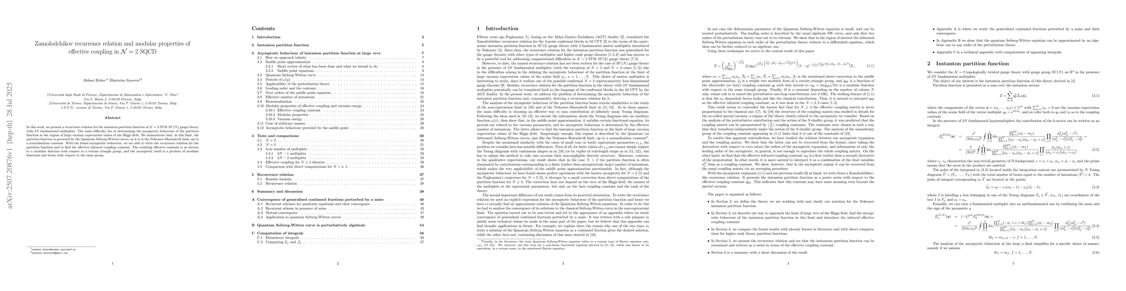 The paper establishes a recurrence relation for the instanton partition function in $\mathcal{N}=2$ SQCD, linking it to modular functions and forms with respect to a triangle group, and demonstrates its consistency with known results for lower-rank theories.
