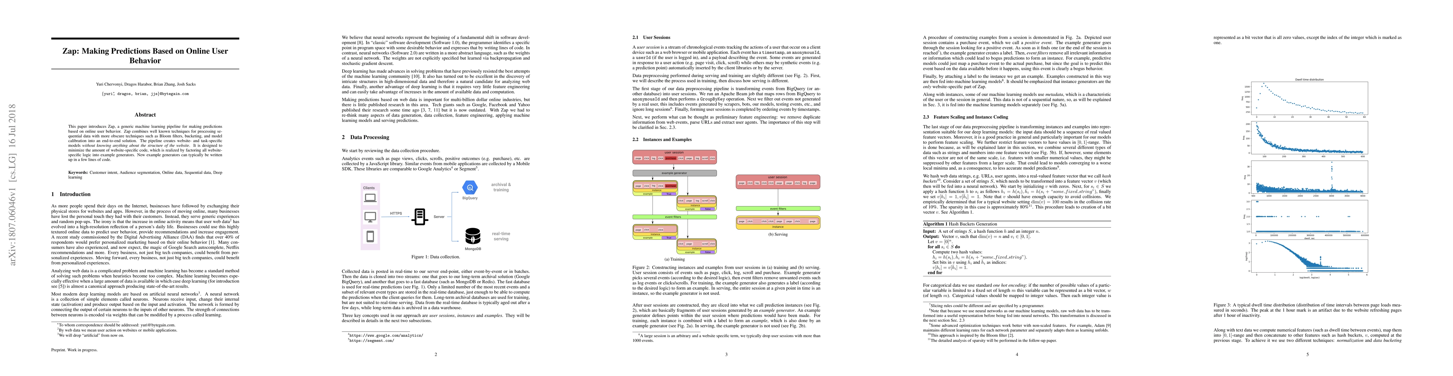 This paper introduces Zap, a generic machine learning pipeline for making predictions based on online user behavior. Zap combines well known techniques for processing sequential data with more obscure techniques such as Bloom filters, bucketing, and model calibration into an end-to-end solution. The pipeline creates website- and task-specific models without knowing anything about the structure of the website. It is designed to minimize the amount of website-specific code, which is realized by factoring all website-specific logic into example generators. New example generators can typically be written up in a few lines of code.