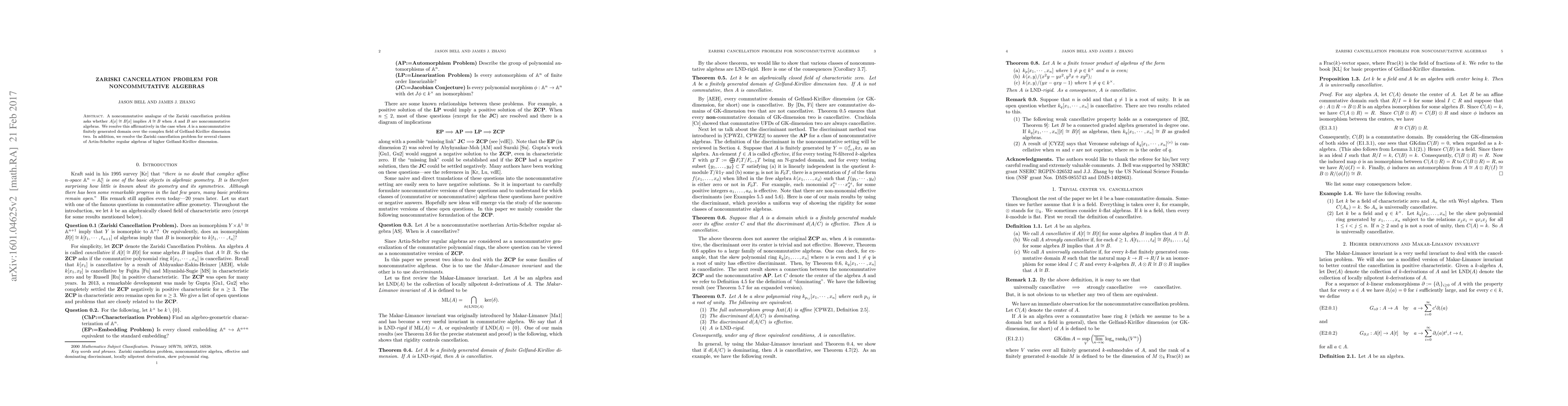 A noncommutative analogue of the Zariski cancellation problem asks whether $A[x]\cong B[x]$ implies $A\cong B$ when $A$ and $B$ are noncommutative algebras. We resolve this affirmatively in the case when $A$ is a noncommutative finitely generated domain over the complex field of Gelfand-Kirillov dimension two. In addition, we resolve the Zariski cancellation problem for several classes of Artin-Schelter regular algebras of higher Gelfand-Kirillov dimension.