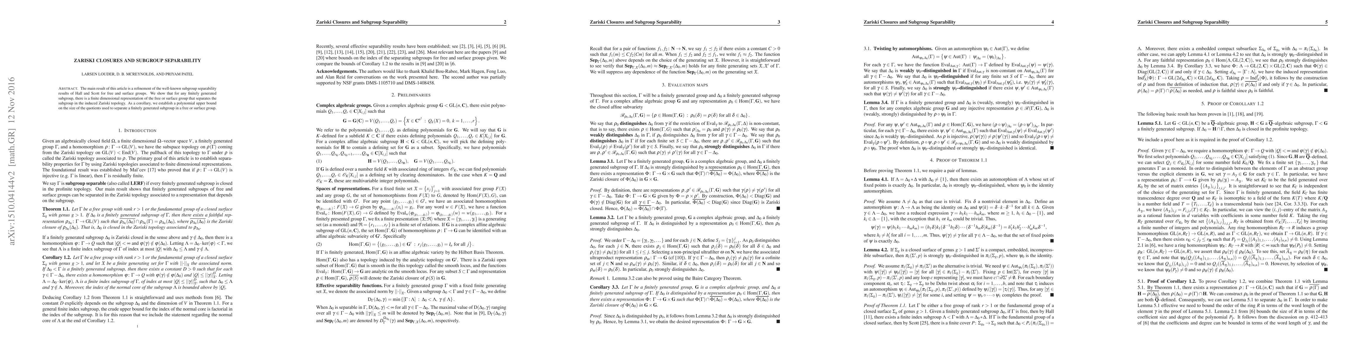 Researchers refined subgroup separability results for free and surface groups, showing that finitely generated subgroups can be separated in the induced Zariski topology using finite-dimensional representations.