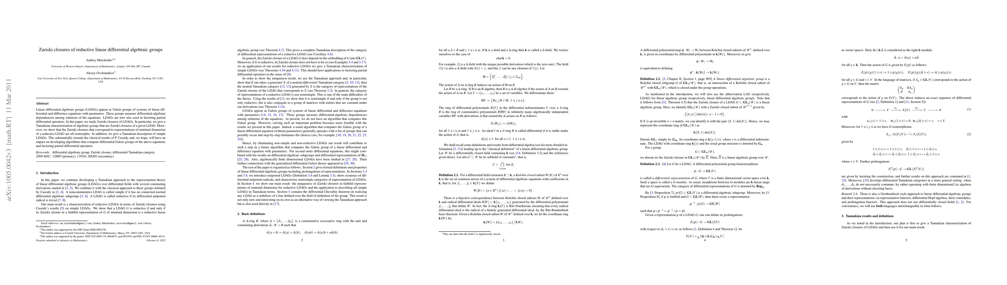 This paper explores the Zariski closures of reductive linear differential algebraic groups (LDAGs), providing a Tannakian characterization of such closures and demonstrating that minimal dimension representations of reductive LDAGs yield isomorphic closures. It also extends classical results and aims to influence the development of algorithms for computing differential Galois groups and factoring partial differential operators.