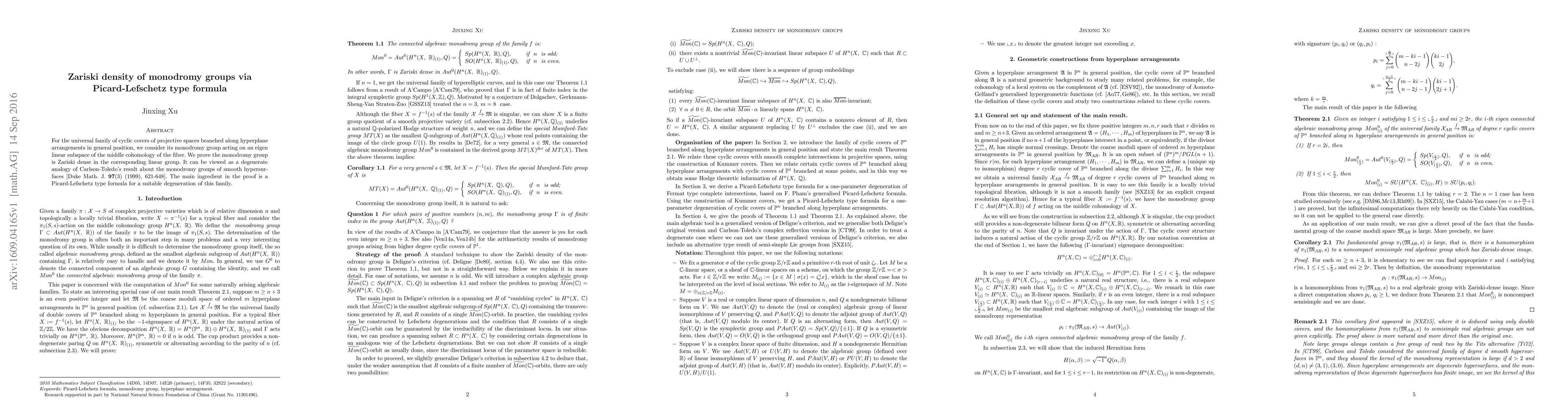 This paper proves that the monodromy group of a universal family of cyclic covers of projective spaces, branched along hyperplane arrangements, is Zariski dense in the corresponding linear group. The proof relies on a Picard-Lefschetz type formula for a suitable degeneration of the family, establishing a degenerate analogy to Carlson-Toledo's result on smooth hypersurfaces.