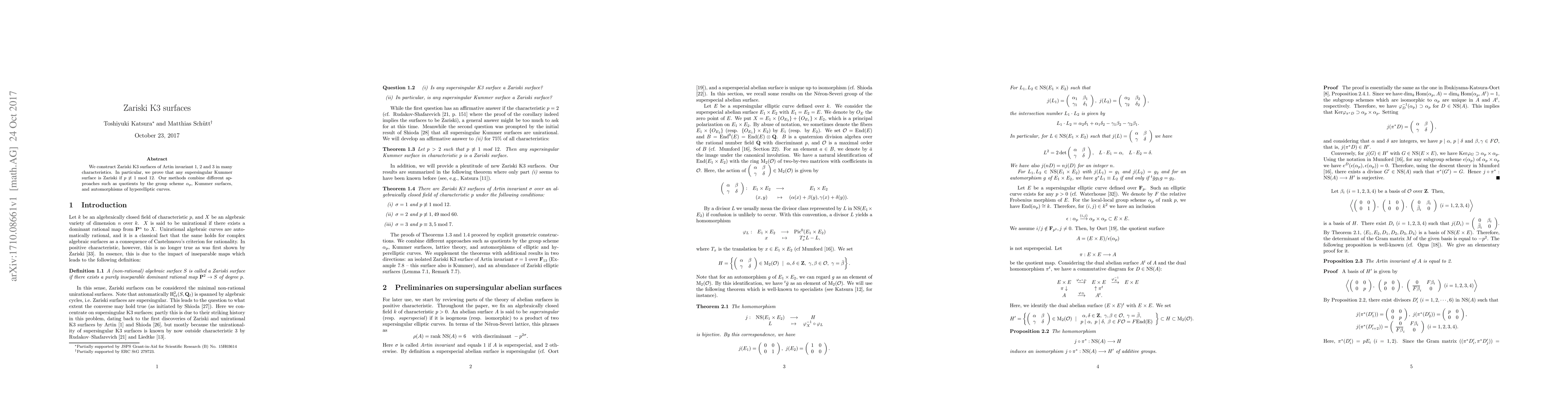 Researchers construct Zariski K3 surfaces in various characteristics, proving that supersingular Kummer surfaces are Zariski if the characteristic is not congruent to 1 modulo 12, using quotients by $eta_p$, Kummer surfaces, and elliptic curve automorphisms.