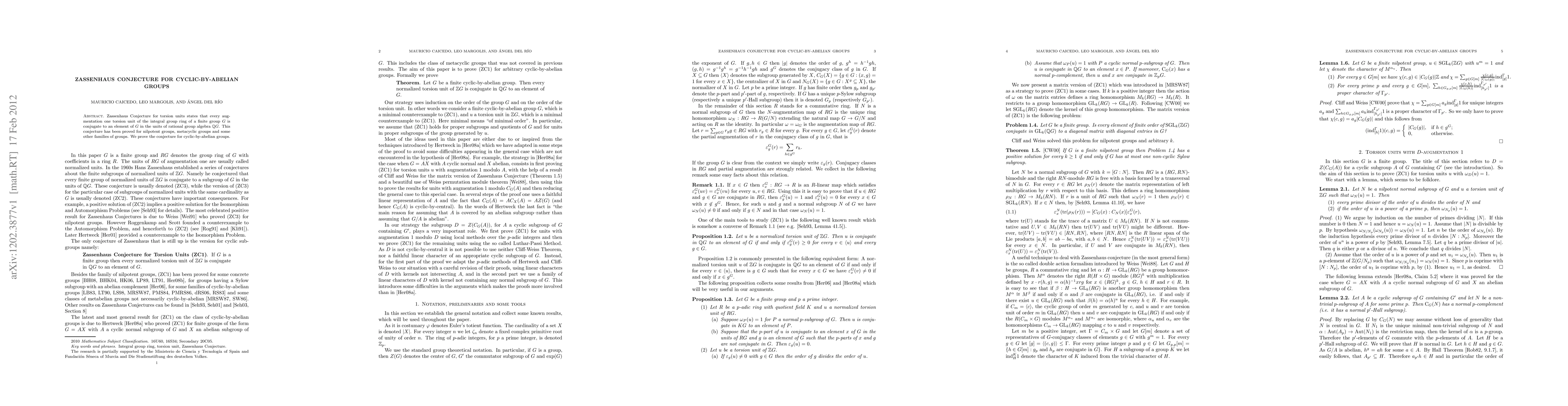 The Zassenhaus Conjecture asserts that augmentation one torsion units in the integral group ring of a finite group G correspond to elements of G in the rational group algebra. This conjecture is now proven for cyclic-by-abelian groups, extending prior results for nilpotent and metacyclic groups.