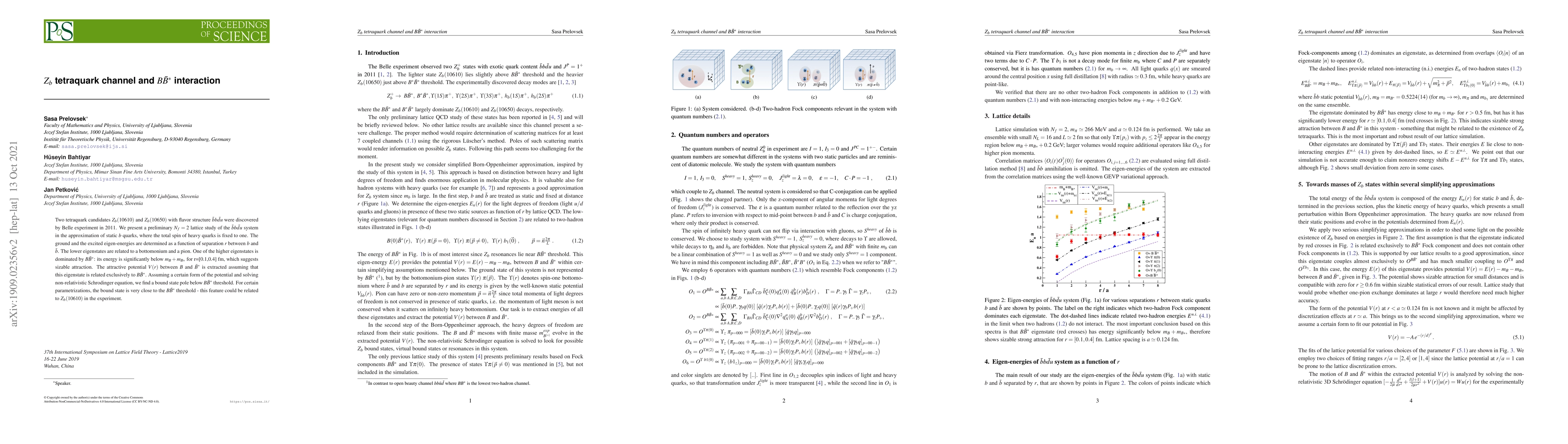 Two tetraquark candidates $Z_b(10610)$ and $Z_b(10650)$ with flavor structure $\bar bb\bar du$ were discovered by Belle experiment in 2011. We present a preliminary $N_f=2$ lattice study of the $\bar bb\bar du$ system in the approximation of static $b$ quarks, where the total spin of heavy quarks is fixed to one. The ground and the excited eigen-energies are determined as a function of separation $r$ between $b$ and $\bar b$. The lower eigenstates are related to a bottomonium and a pion. One of the higher eigenstates is dominated by $B\bar B^*$: its energy is significantly below $m_B+m_{B*}$ for r=[0.1,0.4] fm, which suggests sizable attraction. The attractive potential $V(r)$ between $B$ and $\bar B^*$ is extracted assuming that this eigenstate is related exclusively to $B\bar B^*$. Assuming a certain form of the potential and solving non-relativistic Schrodinger equation, we find a bound state pole below $B\bar B^*$ threshold. For certain parametrizations, the bound state is very close to the $B\bar B^*$ threshold - this feature could be related to $Z_b(10610)$ in the experiment.