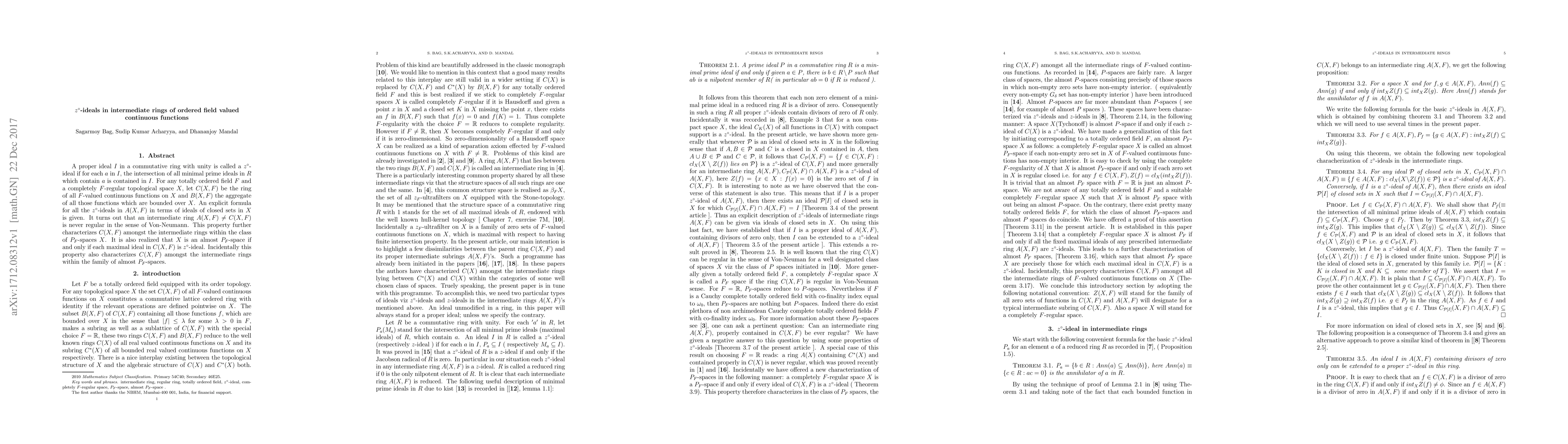 A proper ideal $I$ in a commutative ring with unity is called a $z^\circ$-ideal if for each $a$ in $I$, the intersection of all minimal prime ideals in $R$ which contain $a$ is contained in $I$. For any totally ordered field $F$ and a completely $F$-regular topological space $X$, let $C(X,F)$ be the ring of all $F$-valued continuous functions on $X$ and $B(X,F)$ the aggregate of all those functions which are bounded over $X$. An explicit formula for all the $z^\circ$-ideals in $A(X,F)$ in terms of ideals of closed sets in $X$ is given. It turns out that an intermediate ring $A(X,F)\neq C(X,F)$ is never regular in the sense of Von-Neumann. This property further characterizes $C(X,F)$ amongst the intermediate rings within the class of $P_F$-spaces $X$. It is also realized that $X$ is an almost $P_F$-space if and only if each maximal ideal in $C(X,F)$ is $z^\circ$-ideal. Incidentally this property also characterizes $C(X,F)$ amongst the intermediate rings within the family of almost $P_F$-spaces.