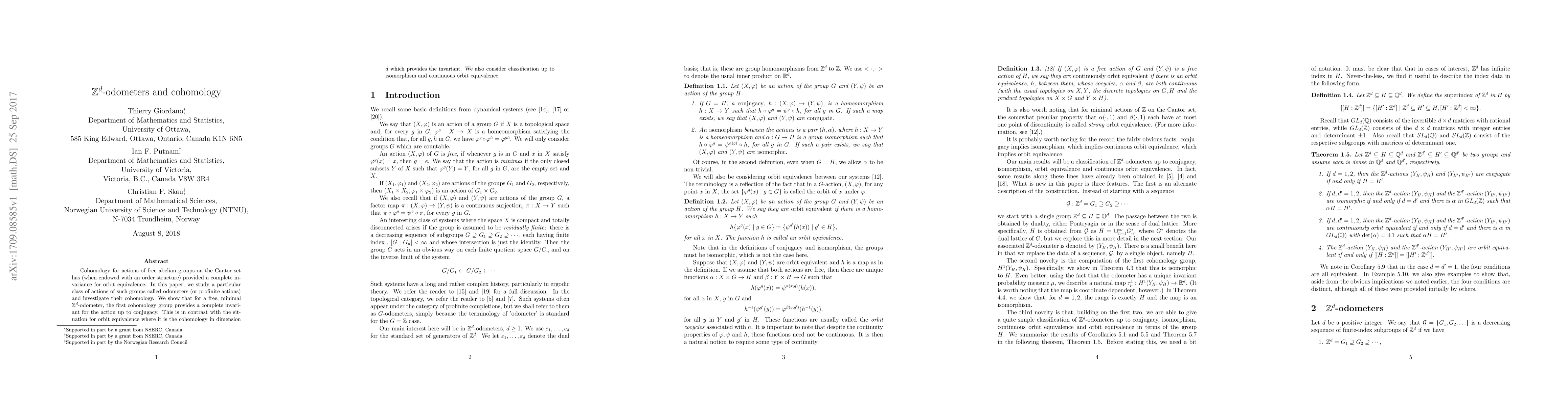 This paper explores the cohomology of $\mathbb{Z}^d$-odometers acting on the Cantor set, demonstrating that the first cohomology group serves as a complete conjugacy invariant for these minimal actions. It contrasts this with orbit equivalence, where higher-dimensional cohomology provides the invariant.