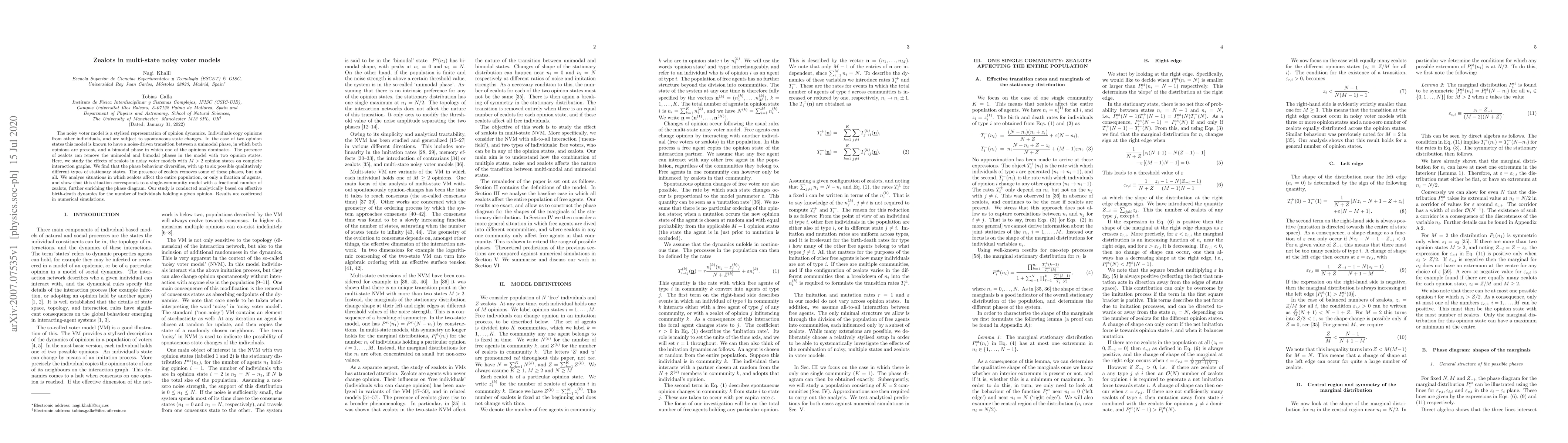 The noisy voter model is a stylised representation of opinion dynamics. Individuals copy opinions from other individuals, and are subject to spontaneous state changes. In the case of two opinion states this model is known to have a noise-driven transition between a unimodal phase, in which both opinions are present, and a bimodal phase in which one of the opinions dominates. The presence of zealots can remove the unimodal and bimodal phases in the model with two opinion states. Here, we study the effects of zealots in noisy voter models with M>2 opinion states on complete interaction graphs. We find that the phase behaviour diversifies, with up to six possible qualitatively different types of stationary states. The presence of zealots removes some of these phases, but not all. We analyse situations in which zealots affect the entire population, or only a fraction of agents, and show that this situation corresponds to a single-community model with a fractional number of zealots, further enriching the phase diagram. Our study is conducted analytically based on effective birth-death dynamics for the number of individuals holding a given opinion. Results are confirmed in numerical simulations.