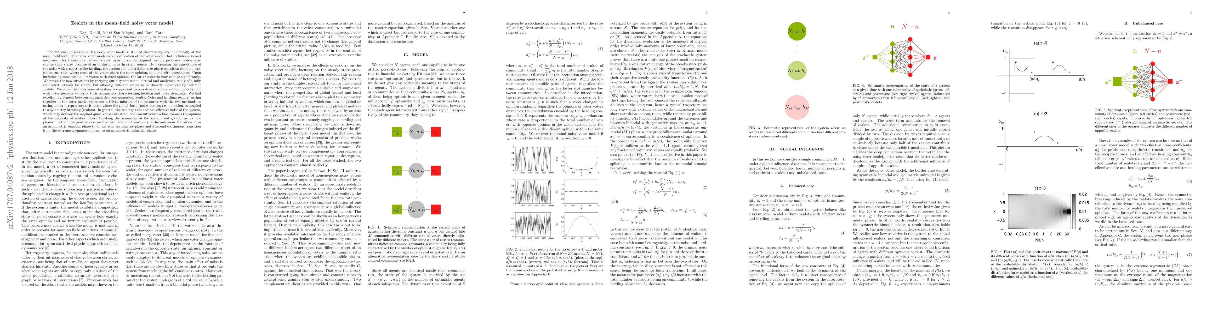 The paper presents a detailed analytical and numerical study of the noisy voter model incorporating zealots, revealing new phases and understanding the interplay between noise, herding, and fixed opinions in opinion dynamics.