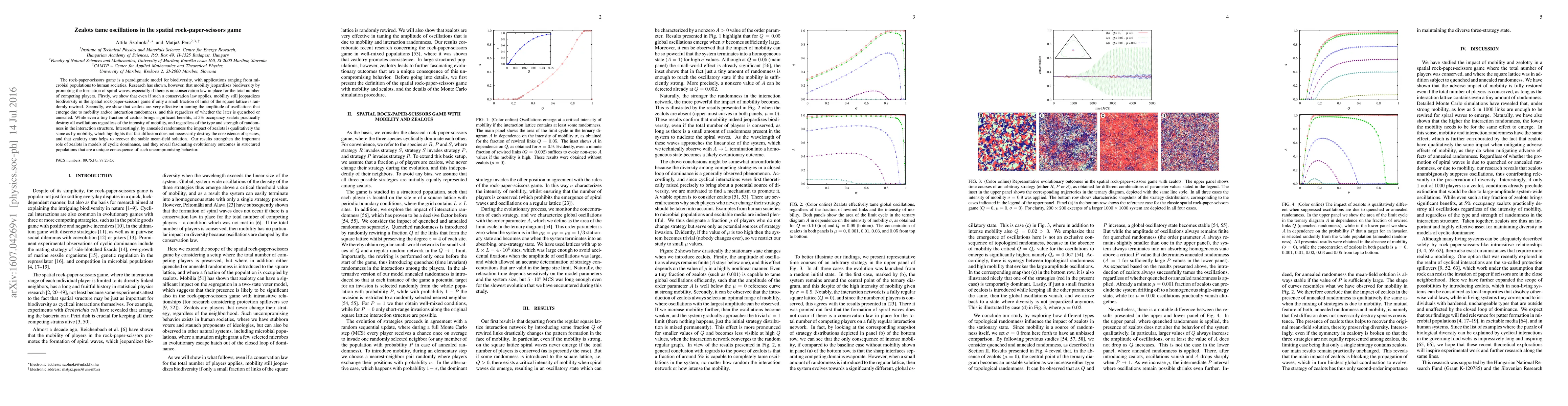 This paper investigates the spatial rock-paper-scissors game, demonstrating that mobility can jeopardize biodiversity by promoting spiral waves. It finds that even a small fraction of "zealots"—players with unwavering strategies—can effectively suppress oscillations caused by mobility or interaction randomness, thereby preserving biodiversity and stabilizing the system.