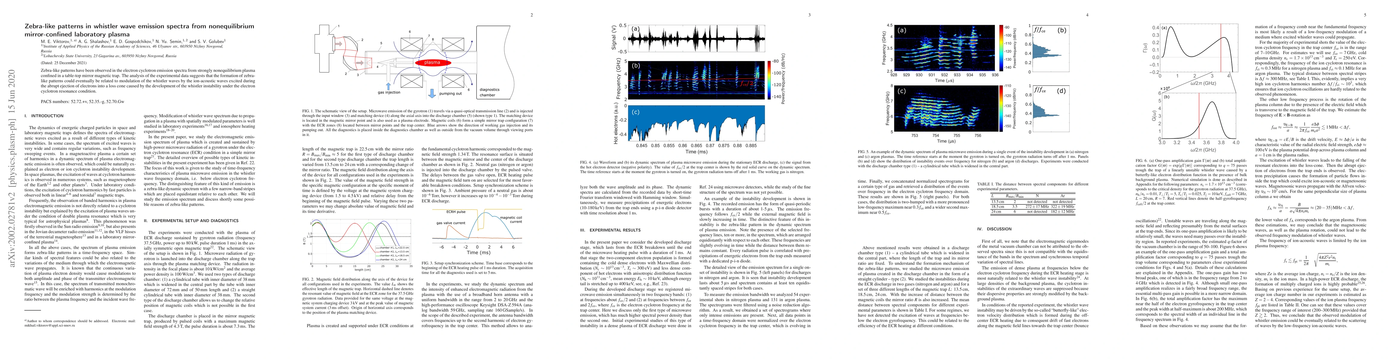 Researchers observed zebra-like patterns in plasma emissions from a magnetic trap, suggesting a connection to whistler waves modulated by ion-acoustic waves.