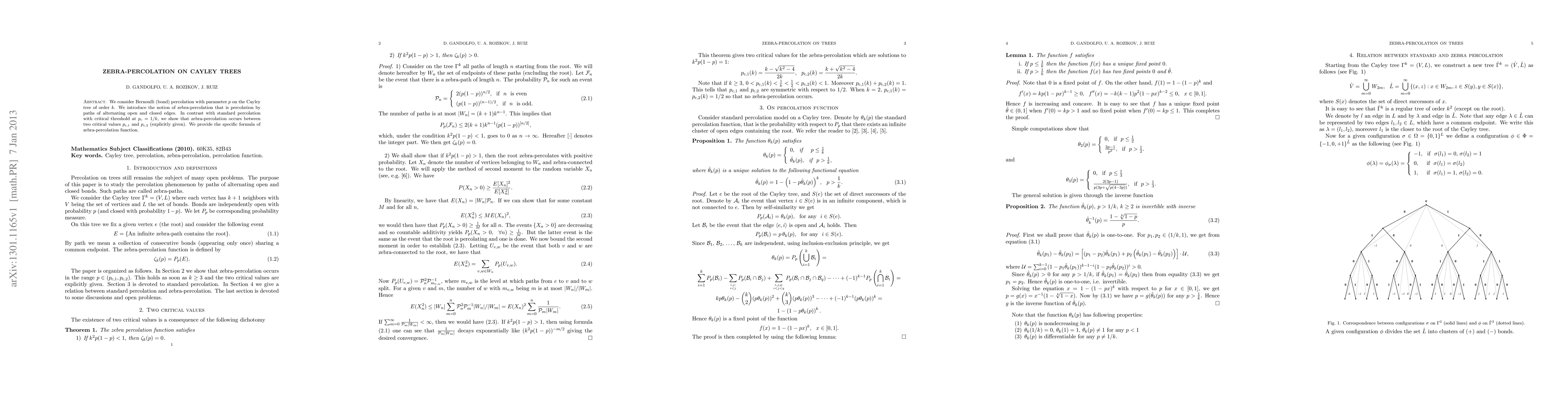 This paper introduces zebra-percolation on Cayley trees, a type of random graph, finding two critical values for path-percolation with alternating open and closed edges.