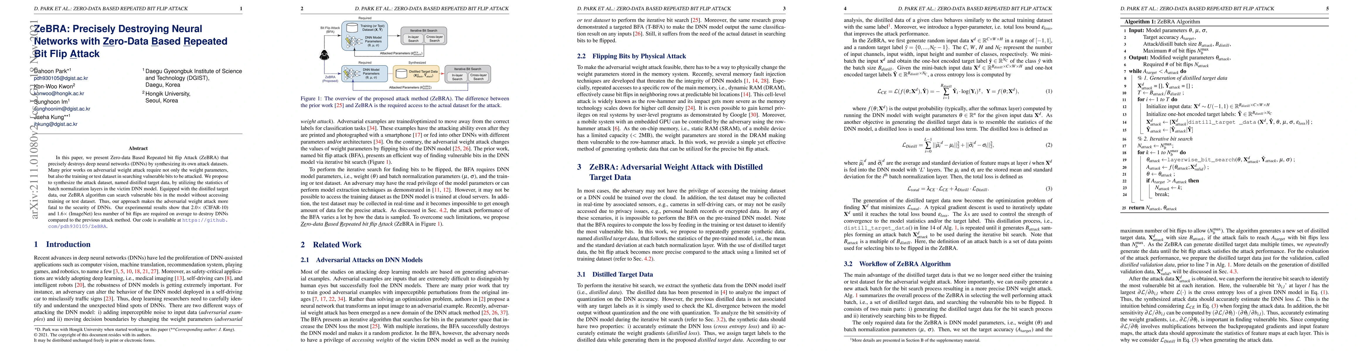 The research introduces ZeBRA, a Zero-data Based Repeated Bit Flip Attack that synthesizes its own attack dataset (distilled target data) using batch normalization layer statistics, enabling adversarial weight attacks without requiring original training or test datasets.