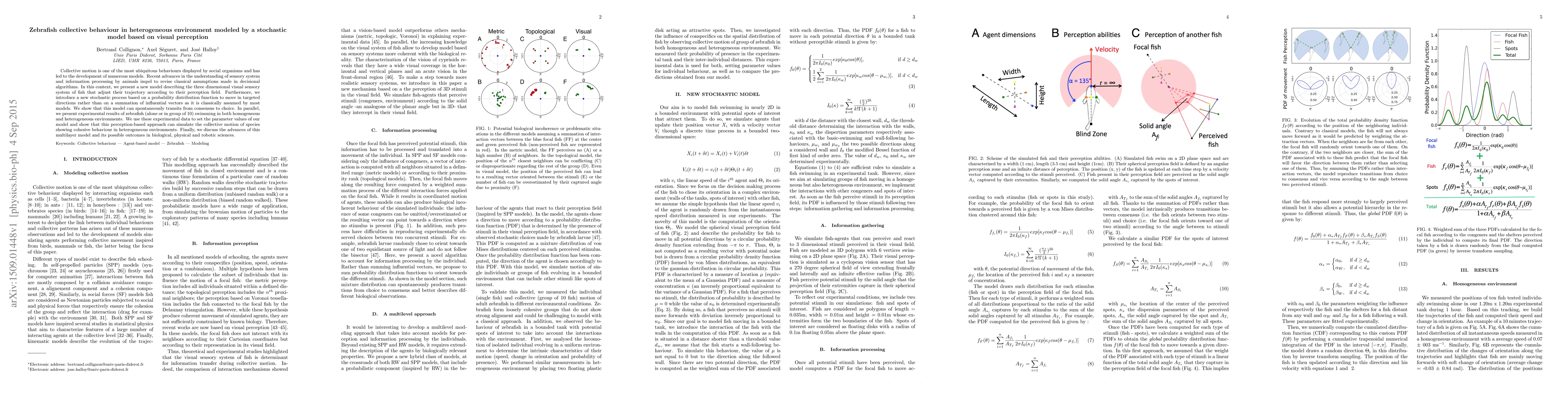 This paper introduces a novel stochastic model based on zebrafish visual perception to simulate collective behavior in heterogeneous environments. It revises classical decisional algorithms by incorporating a new probability distribution function for targeted movement, demonstrating the model's ability to transition from consensus to choice, validated by experimental data from zebrafish.