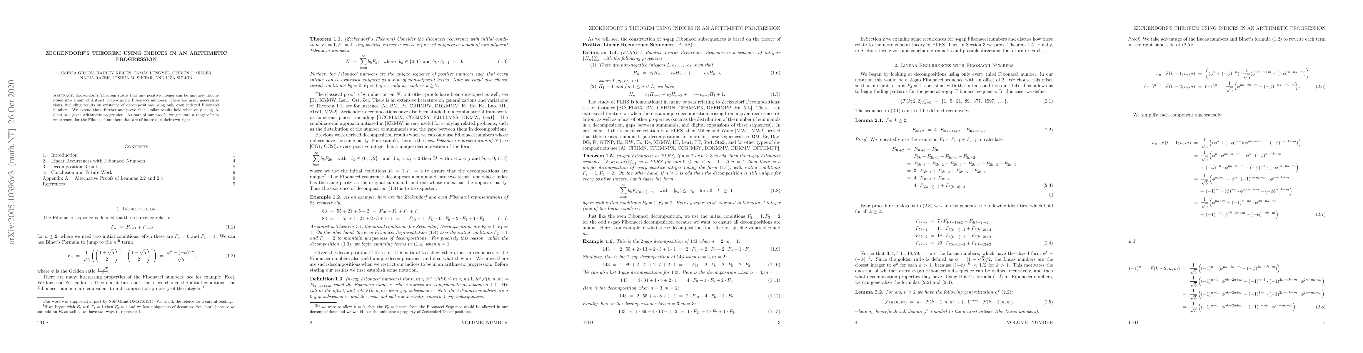 Zeckendorf's Theorem is extended to show that any positive integer can be uniquely decomposed into a sum of distinct, non-adjacent Fibonacci numbers from any given arithmetic progression. New recurrences for Fibonacci numbers are derived as part of the proof.