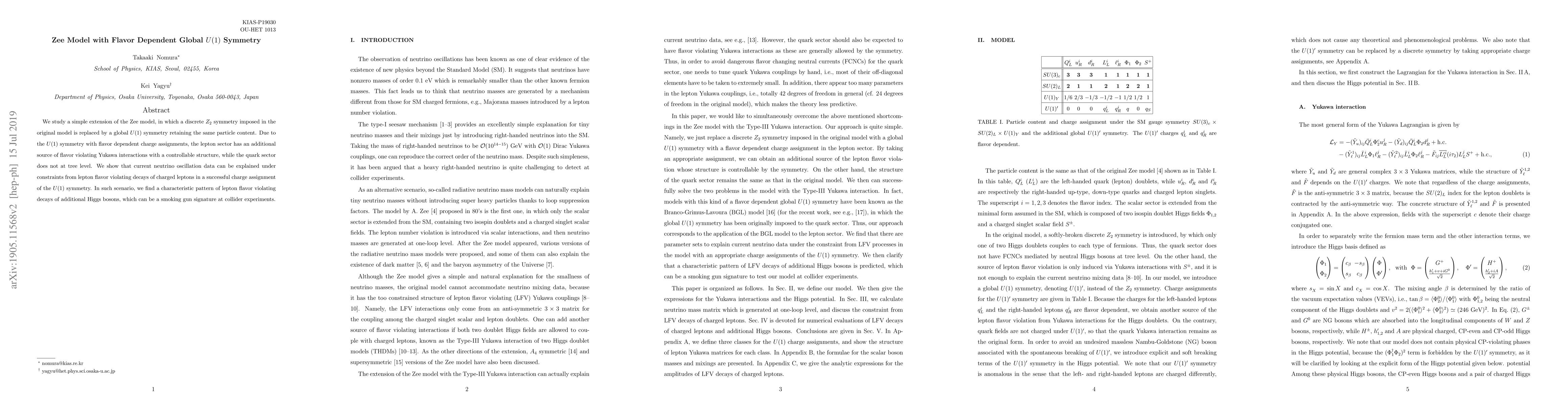 This paper extends the Zee model by replacing its $Z_2$ symmetry with a global $U(1)$ symmetry, introducing flavor-dependent charge assignments that generate new Yukawa interactions in the lepton sector. It demonstrates that this model can explain current neutrino oscillation data while predicting distinctive lepton flavor violating decays of additional Higgs bosons, potentially observable at collider experiments.