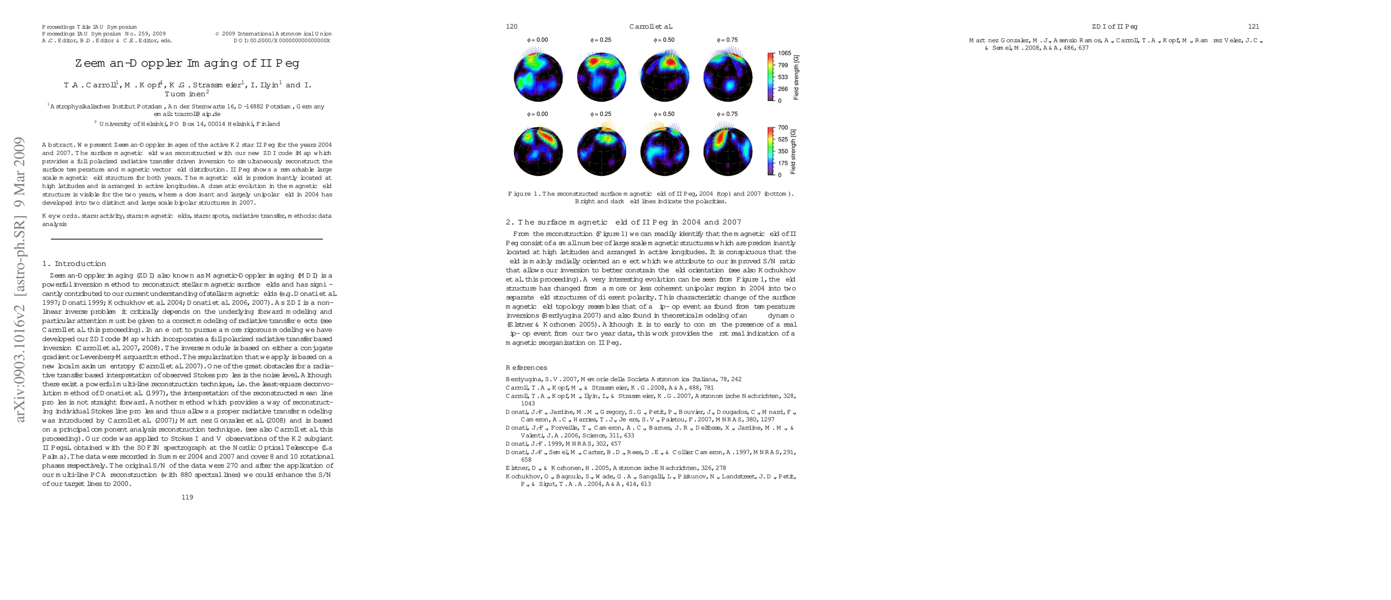 We present Zeeman-Doppler images of the active K2 star II Peg for the years 2004 and 2007. The surface magnetic field was reconstructed with our new ZDI code "iMap" which provides a full polarized radiative transfer driven inversion to simultaneously reconstruct the surface temperature and magnetic vector field distribution. II Peg shows a remarkable large scale magnetic field structure for both years. The magnetic field is predominantly located at high latitudes and is arranged in active longitudes. A dramatic evolution in the magnetic field structure is visible for the two years, where a dominant and largely unipolar field in 2004 has developed into two distinct and large scale bipolar structures in 2007.